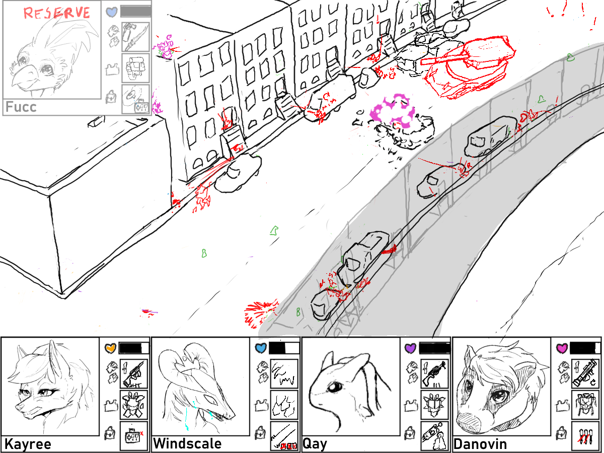 The closest fox moves toward cover. Qay is on the lookout and fires! She hits! The enemy explodes in a spray of gore.