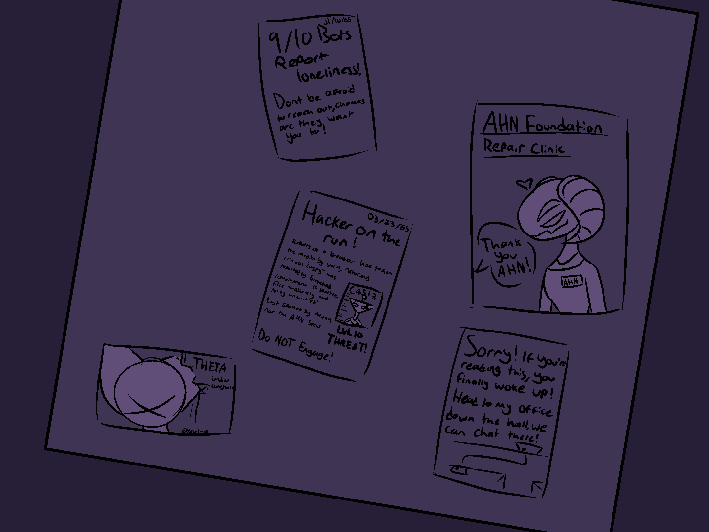 "Single planet, organic life outside the sectors and on other islands but we've isolated our societies to this island to preserve life. 9 sectors, each founded and ran by an AHN model. We're currently in sector 7. Ahn 1, 3, and 9 are dead... Well, 1 and 3 are confirmed, 9 has lost contact and is assumed dead but who knows, uhhhh... Society in each sector is a little different, but generally the same, bots are made, choose a job, work for their entire lives, die somehow. But take that with a grain of salt from me as I'm entirely biased with the idea of anarchy and freedom to do whatever."