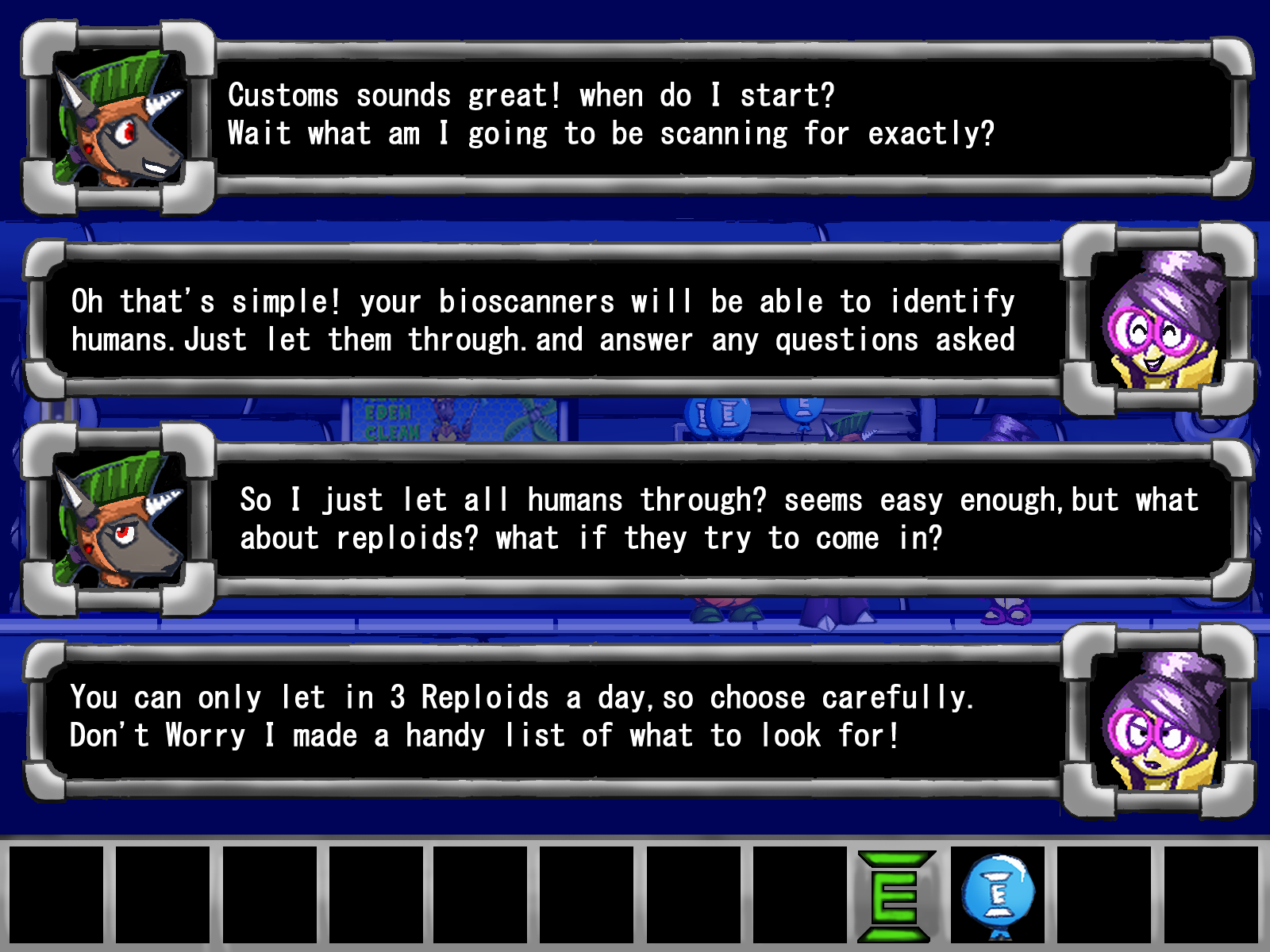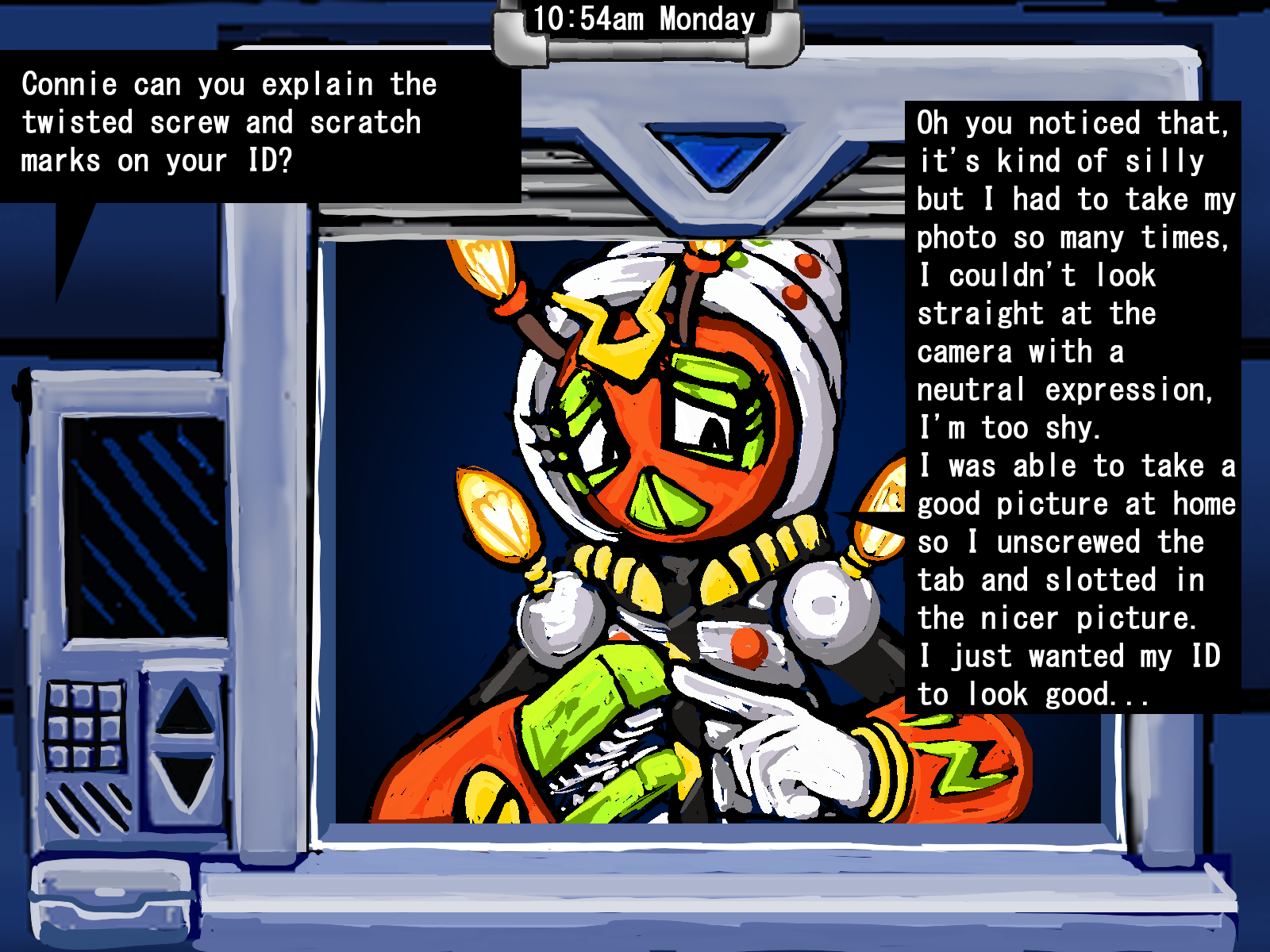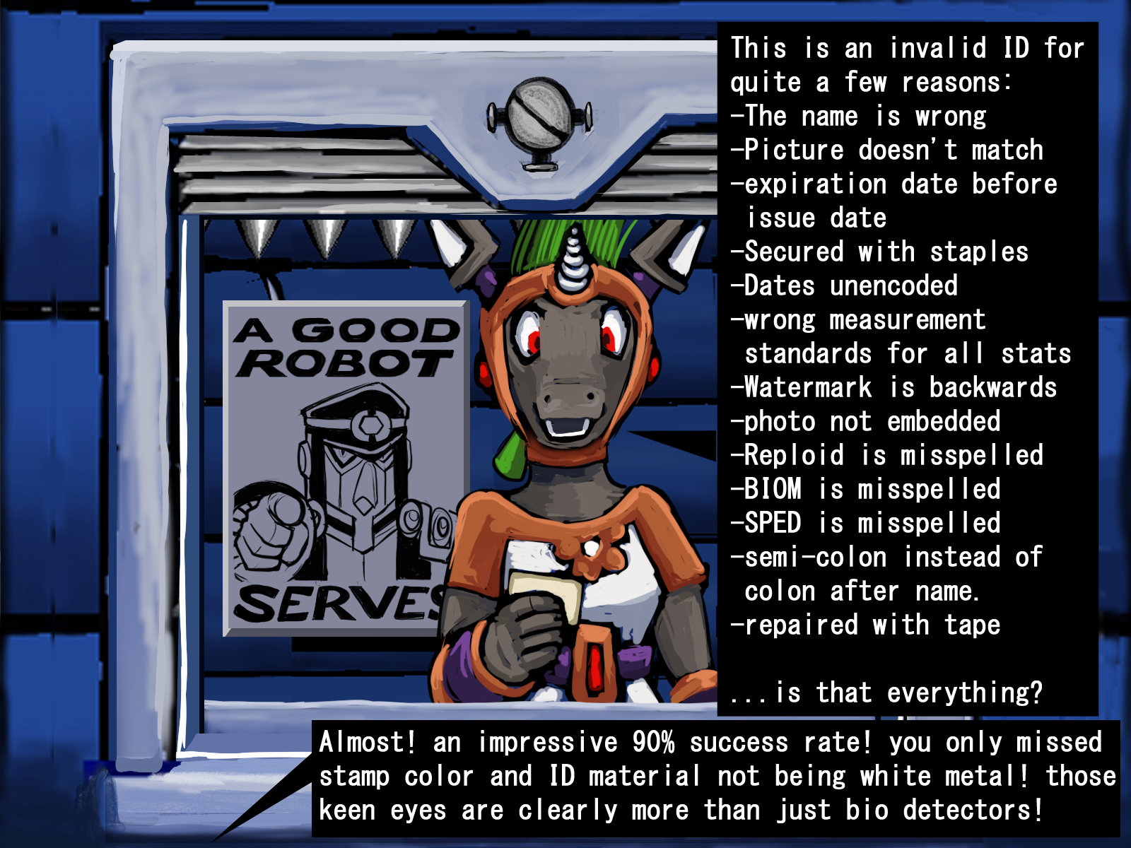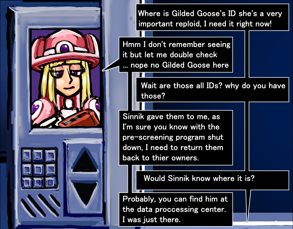 Oh no! Chemical Formixer does not have an ID Card, and never has. She has always been in Eden, so she never had to come through customs; and she doesn't leave the park grounds. She also does not have a manufacturer's mark! She knows that Dr Eve would never kick her out since she is a good reploid, but it makes her sad to be reminded that she is different from the others.