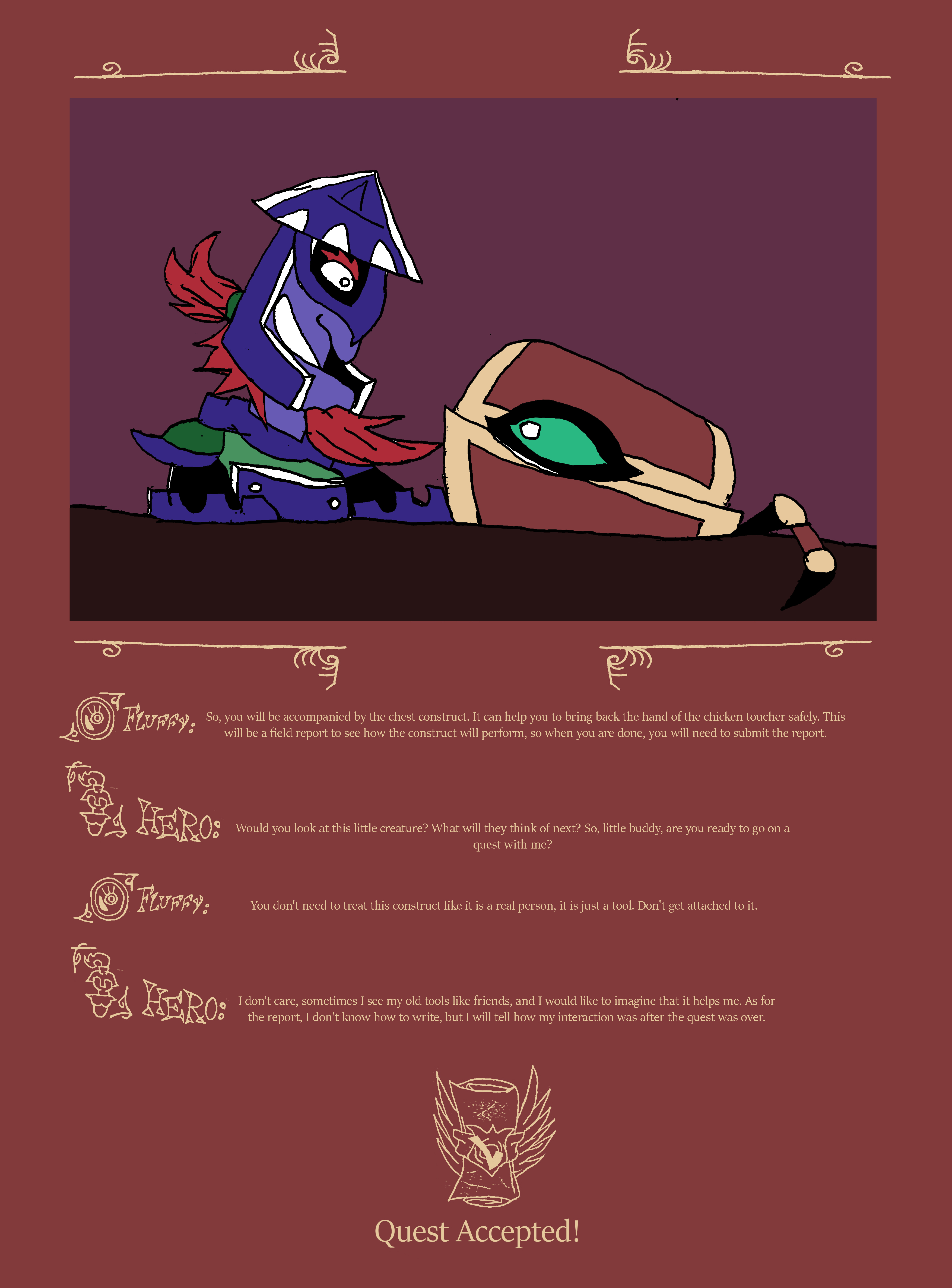 As far as the village champion goes, if we give him the hand of the chicken toucher (since that has most votes), he is probably gonna get pretty pissed that we are giving him an easy mission considering he is experienced, and the mission is labeled as a minor nuisance, much like the farmer knight was insulted that we gave him an easy mission (description said he's pretty much like the farmer knight after all). Therefore, if we want to have him take this mission, we gotta do a bit of mind games to make it look more enticing to his skills by first recommending he use a construct.