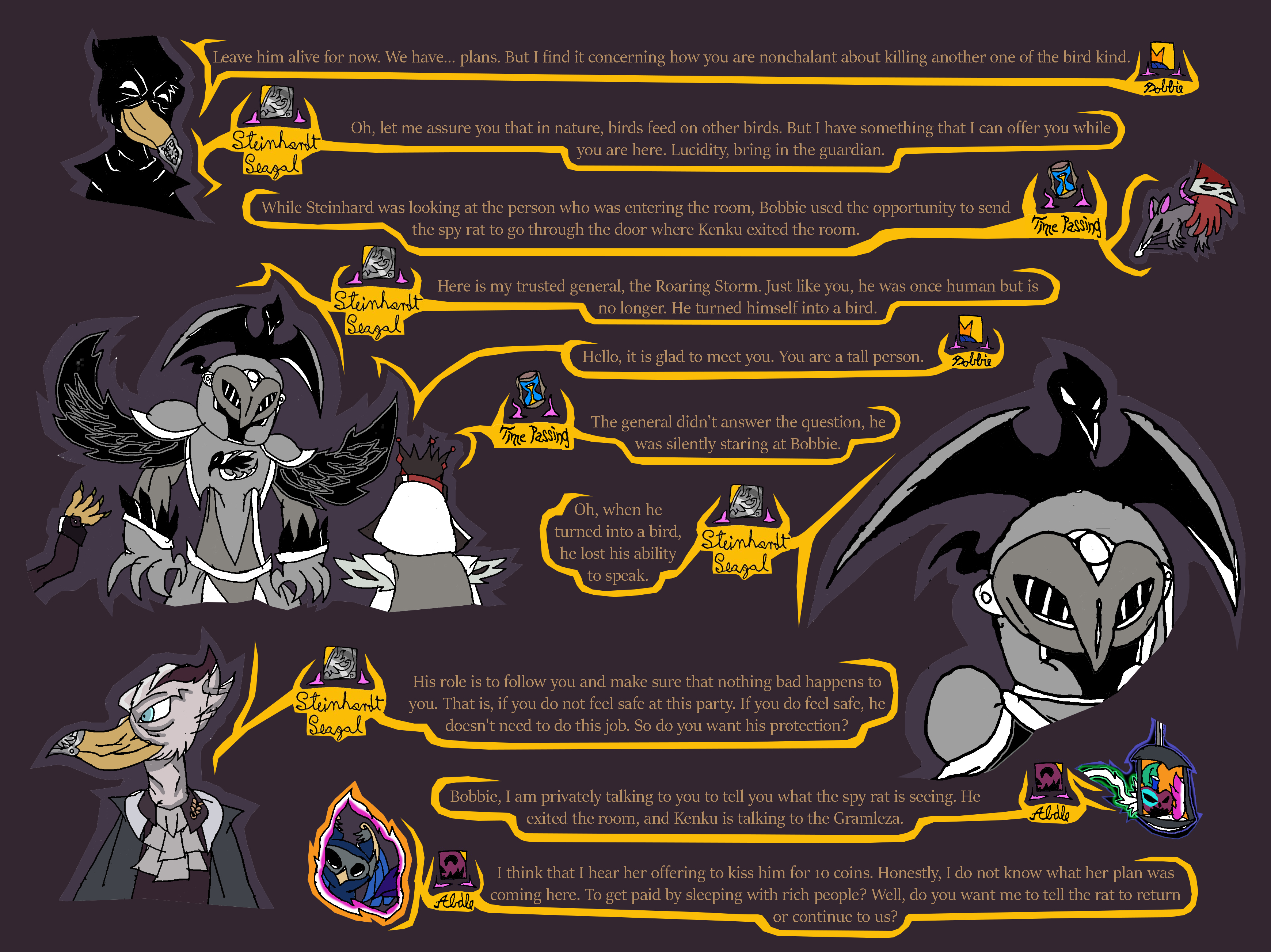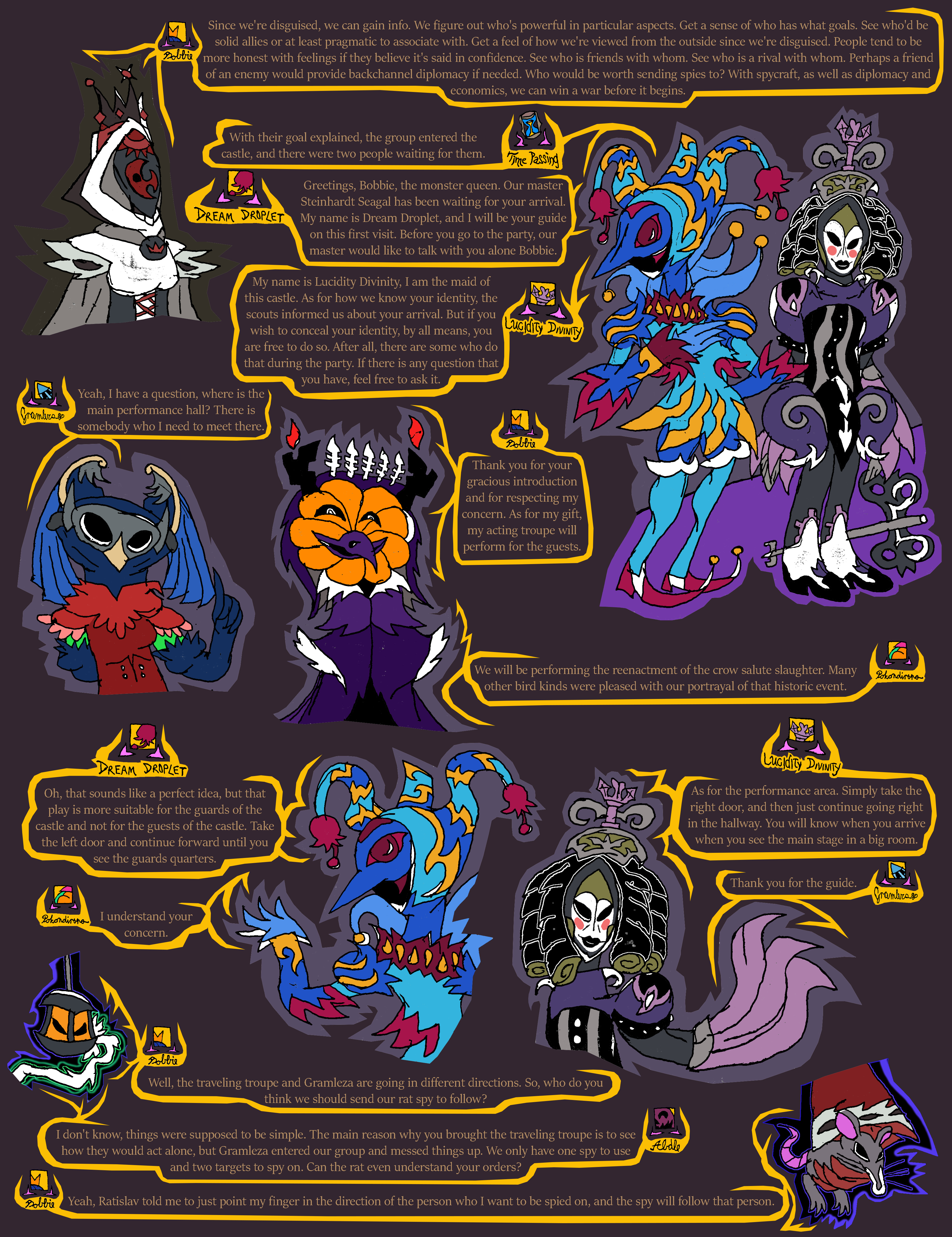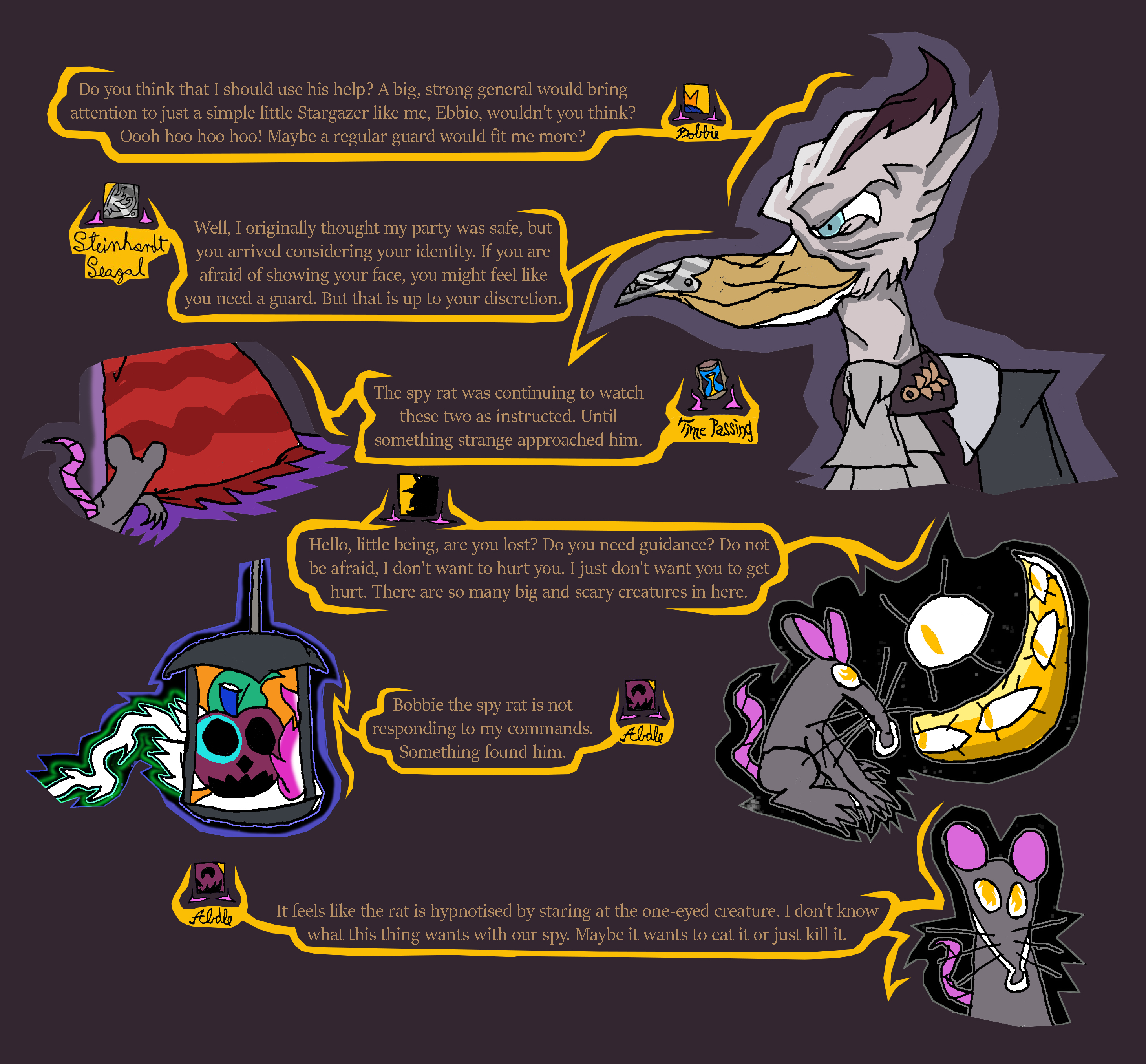 lastly, that was the second time today that spy rat got caught. We need to have a serious talk with Ratislav about training his rat spies, otherwise they could get caught and eaten. With that in mind, I think we shouldn't let spy rat back out right away until after Maya Din is done talking with us, and when the performance begins since that is starting soon. People will be distracted during that time to notice the rat.