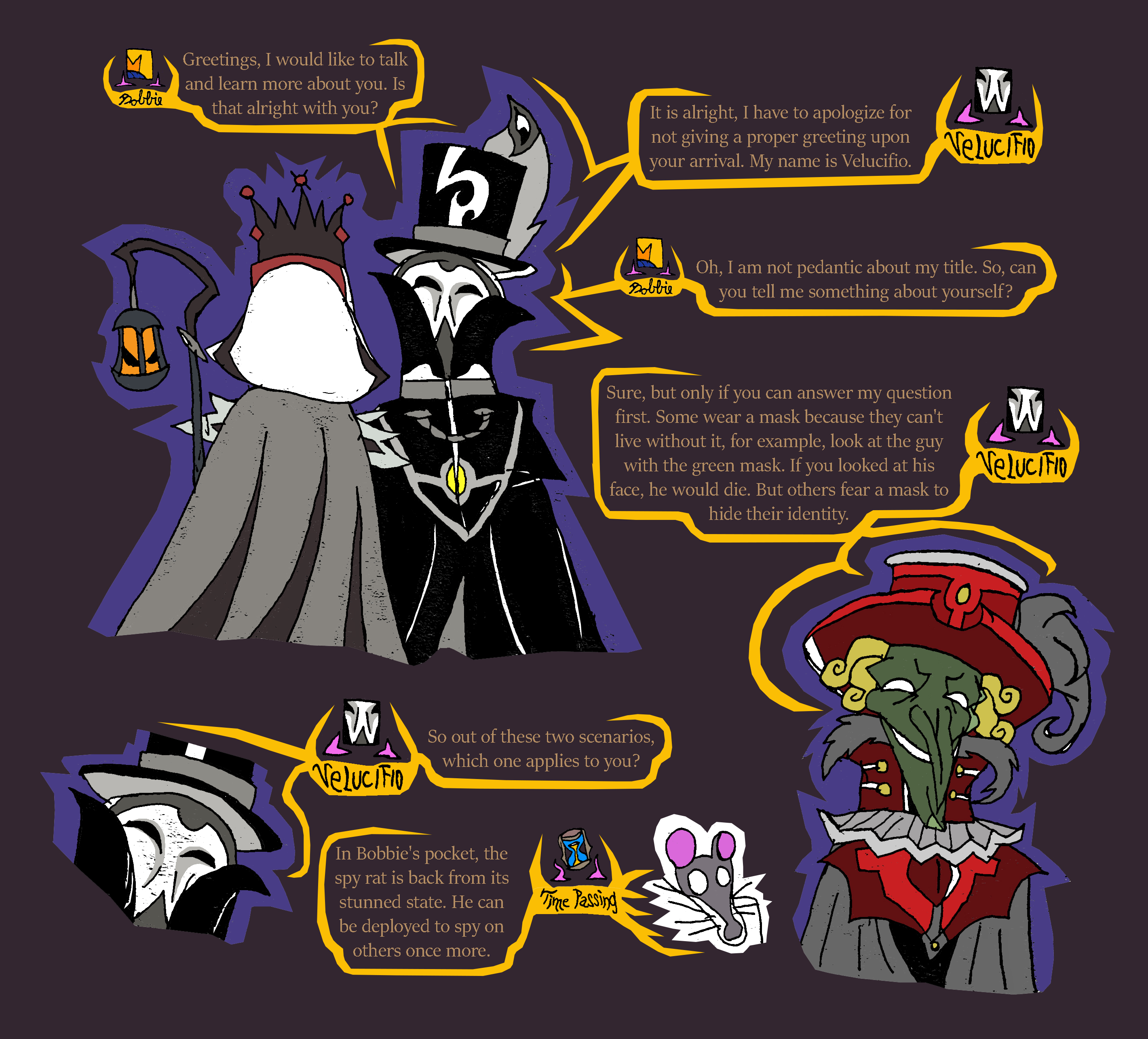 guy in green mask: Dizelu's the name. appreciated those paintings. Is looking for leader of the Banisters with the man in top hat and mask, Velucifio. Try not to look under Dizelu's mask, you'll die seeing his real face.