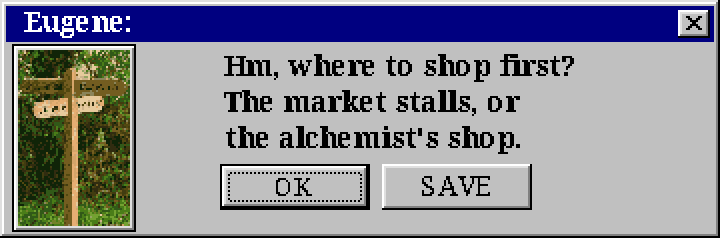 Malcolm: “Hah-hah-hah! Oh but Eugene, her majesty isn’t the one paying me for it. I’ve got a few other orders to finish up this morning. ”Where did I put that bottle of tree’s beak… Ah never mind. If you care to bargain for a moment perhaps we can work something out. I can brew up your usual order and some special ‘wine stain’ remover for twelve gold, three copper, top priority.”
