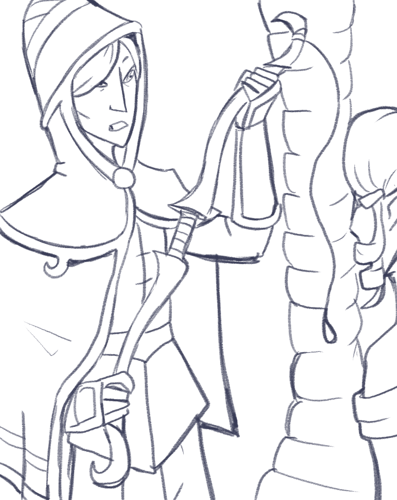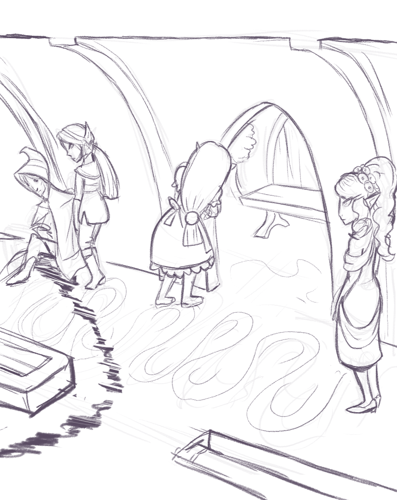 Iolantha looks into the kitchen, she doesn't see anything in there she whispers to Eranil ' keep a look out at the water basin, I think somethings hiding inside, I'm going to gather supplies' Eranil nods