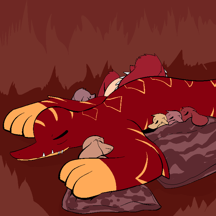Everything is a special sort of pleasant here. I cannot feel the cold currents that come from the cavemouth and make bones chill. There is no hazy smell of a fire burning far off, no pain, no rats nipping at my loose scales.... It's quite as well, I cannot hear |||||| in my head like I used to, I feel so very small without her presence. But the looming shadow is gone, I can be happy again! We can even go hunting like we once did, and kill and eat and play and......