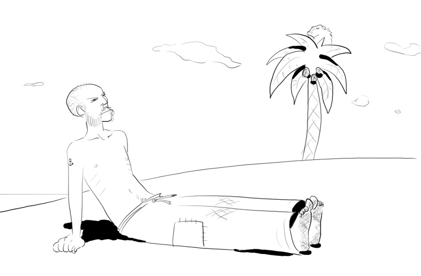A MAN IS DESERT ISLAND. Only on island is tree where is baboon what only sing jap cartoon shitty theme song. Man cannot only bravery substain because it is hot and desert.