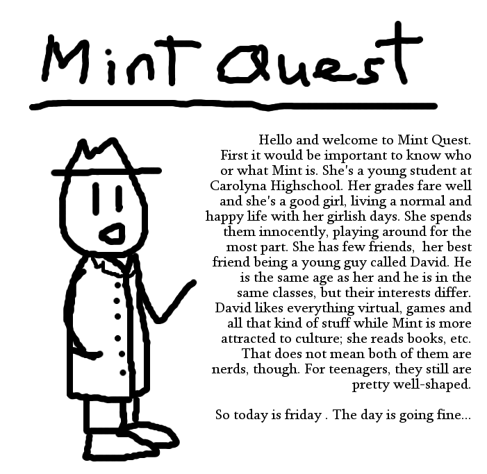 <- Hello, dear reader. This is my first quest. I have decided to call it "MintQuest". I hope you will enjoy it. The little guy on the left explaining what's going on is kind of my avatar, you could say. He won't take any part in the quest. To begin, simply read the very small insight of Mint's life and you will be good to post after the next picture which will set us up inside of her school. Enjoy yourself, for I know I will.