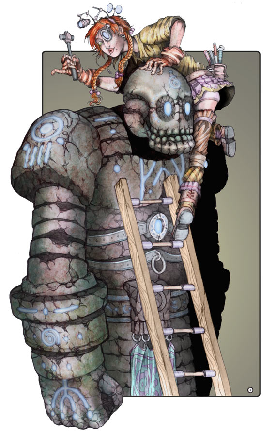 You are a Soul Grave, a siege golem crafted by the powers of one of the high mages with the mass of dead gathered from a battlefield. You stand some fifteen feet tall and weigh over fifteen thousand pounds of thickened, hardened metals and alloys, although at the time of your creation, only crude bronze and a few bits of iron where available for your construction, so you are far from invulnerable in your current state. You are a powerful weapon of war, a siege breaking shock-trooper designed to tear down defenses and slaughter the inhabitants. Your right arm ends in a grand claw, it's three wicked blades each five feet long and wickedly edged. You left arm is far more weighty, ending in an over-sized forearm with a massive fist, designed to burst through braced doors or batter down walls. Each of your shoulders holds a powerful mid range mortar, a prepared shot ready in each for immediate use. And even further, you possess powerful magics that draw upon the essence of the souls entombed within you, allowing you to spread otherworldly fire called 'Soulfire' that ravenously consumes all it touches in a great cone from your mouth, at the cost of forever burning away some of the souls which sustain you. Your body needs feul to work. You must consume a minimum of five pounds of metal a day, with additional metals being needed if damages are received until such time you are whole again. Further, you can grow new mortars, given enough time and available subsistence. You require a certain minimum number of souls to continue functioning (twelve minimum), and currently you possess fifteen. One soul is extinguished every month of activity, and three souls are consumed every time you breathe Soulfire. ....And now you are reawakened, after being put into a hibernating slumber after the last exchange between you home of Mosmordre and Castiliathen, while mages repaired damages from a previous battle. Only Message too long. Click here to view the full text.