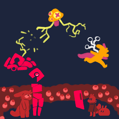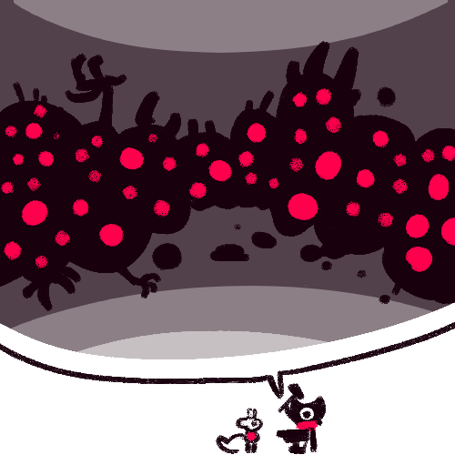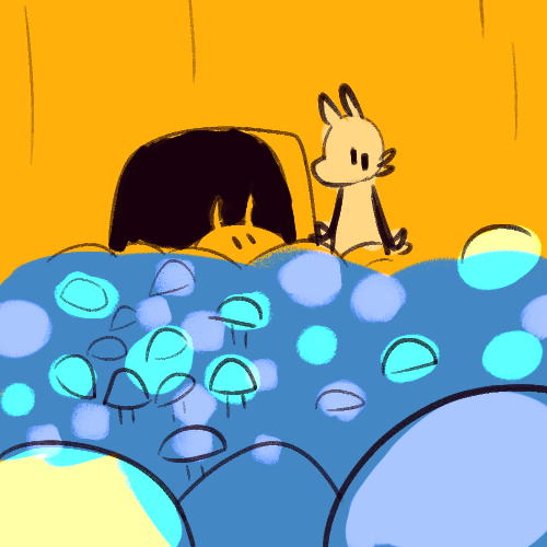 Even if the two of them can't bring themselves to leave, if they don't push people away using all these spores, they might get people visiting and bringing them stuff. Like food! Or news! The slime colony has got these really delish mushr-ooo wait, would that be cannibalism? Anyway, if they could at least stop their spore thing - or reduce the radius and let slimes past - to accept visitors then they'd have a lot more space to consider whether the world's still dangerous and they gotta hide and hurt people and all that compost at all.