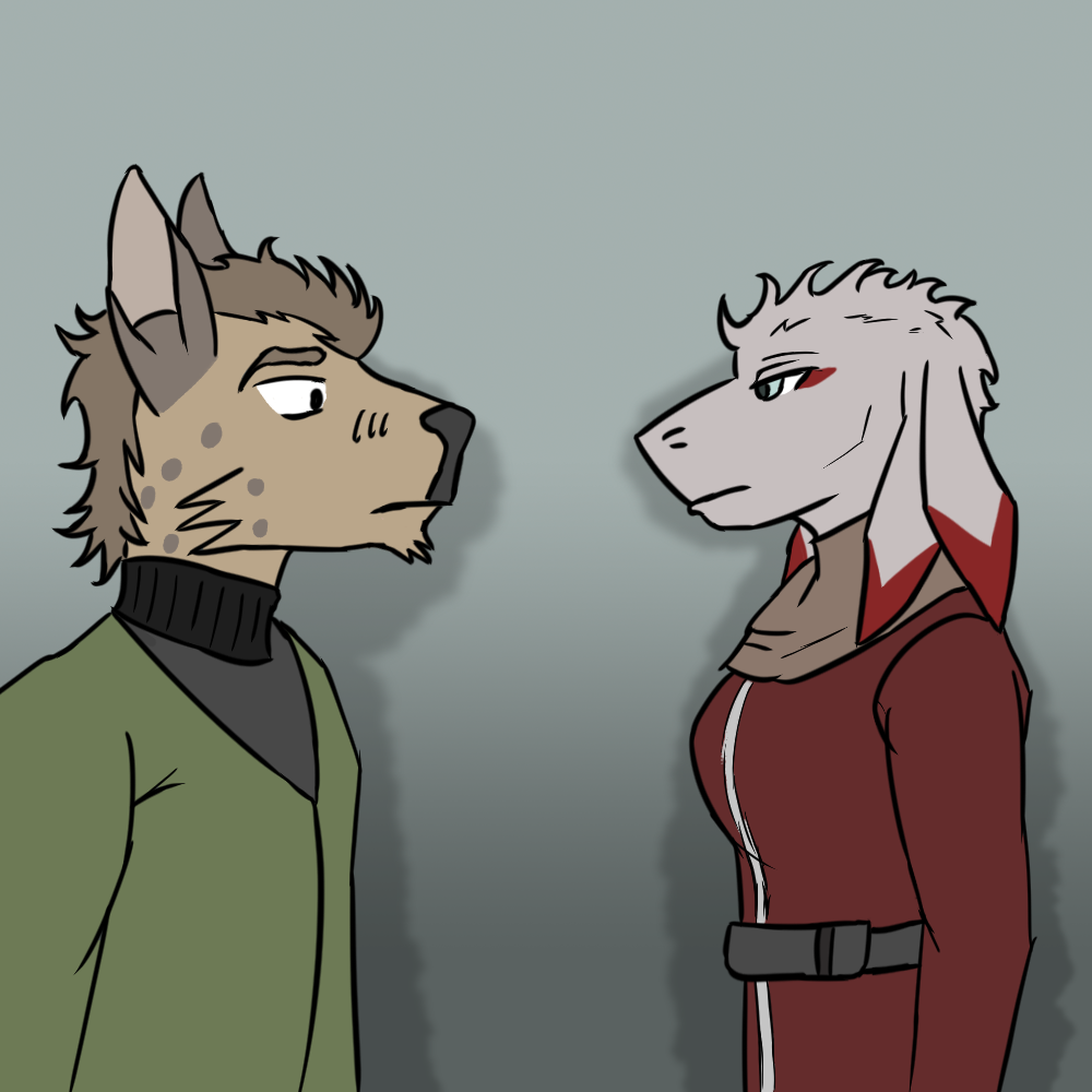 Seene brushes at her angular ears. They remind me a bit of rank chevrons, and it makes me want to tug on it, put it on my lapel.