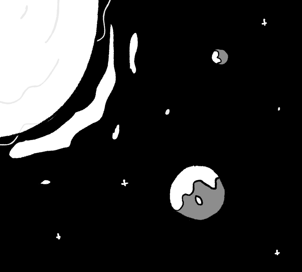 A vast stretch of space, a pale blob rotating around a blinding star. The nearby planets are being devoured from the outside in by white specks.
