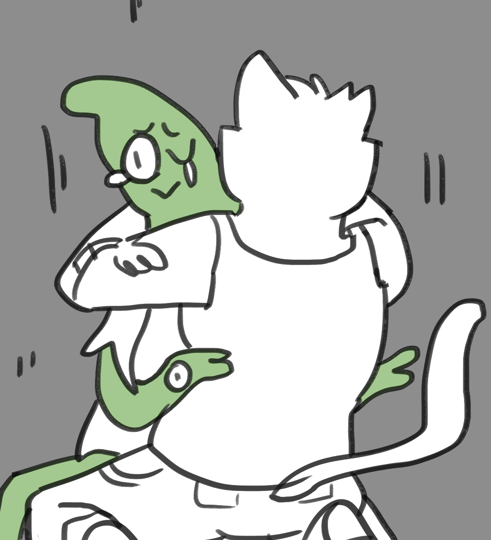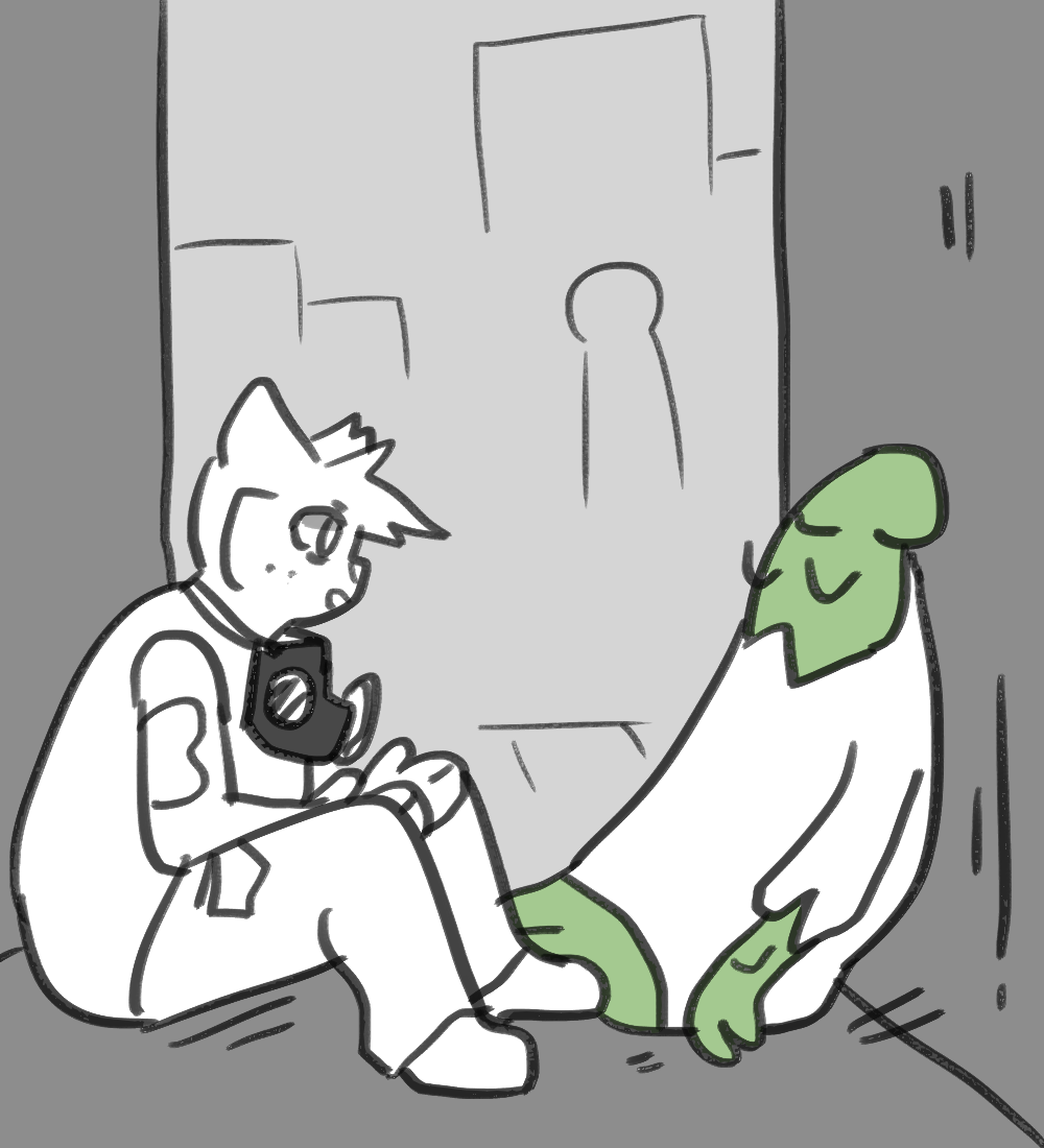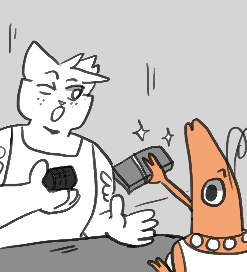 Uzak glances nervously at Maddie’s scaly metal arm then hands over the goods. Maddie rubs her face against the little bar and finds a place to tuck it into her pile, before flopping on top of it.