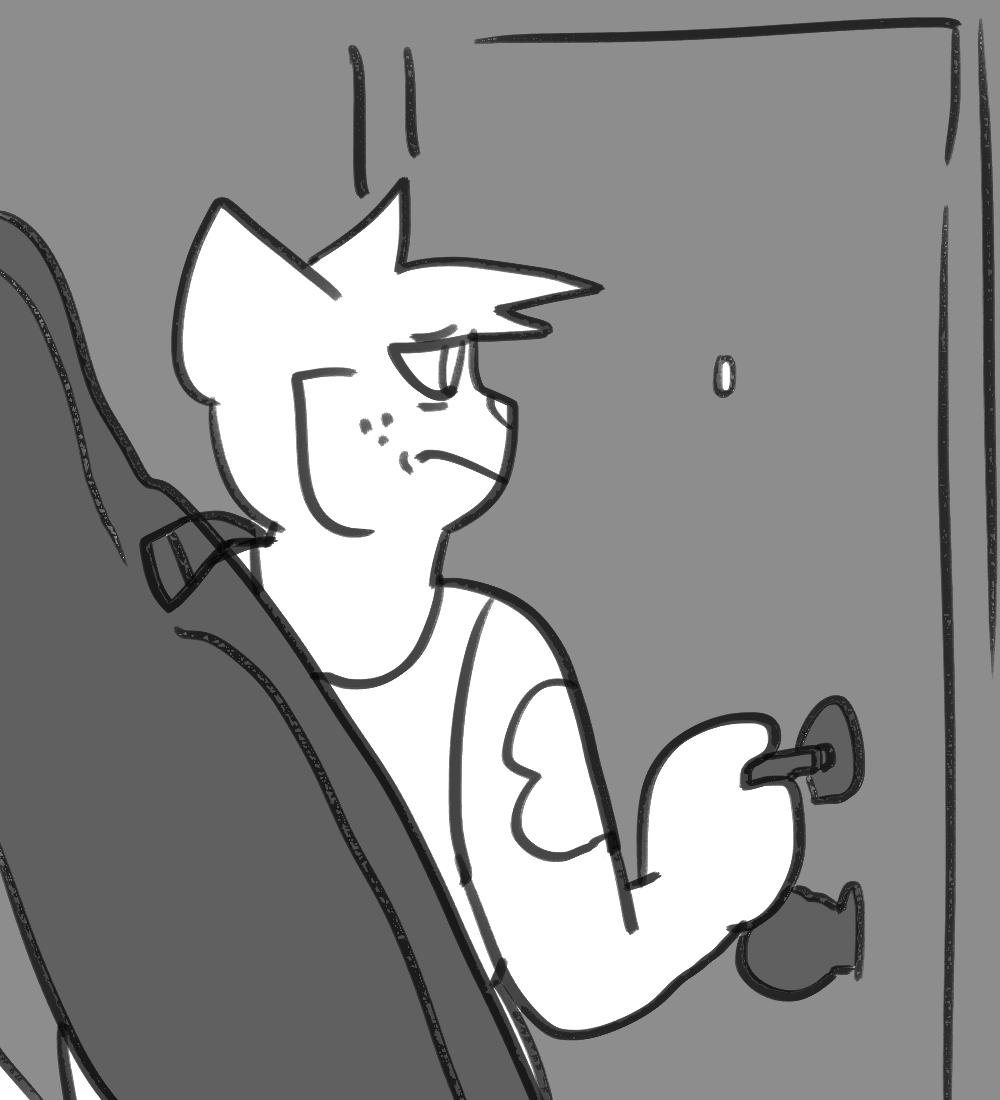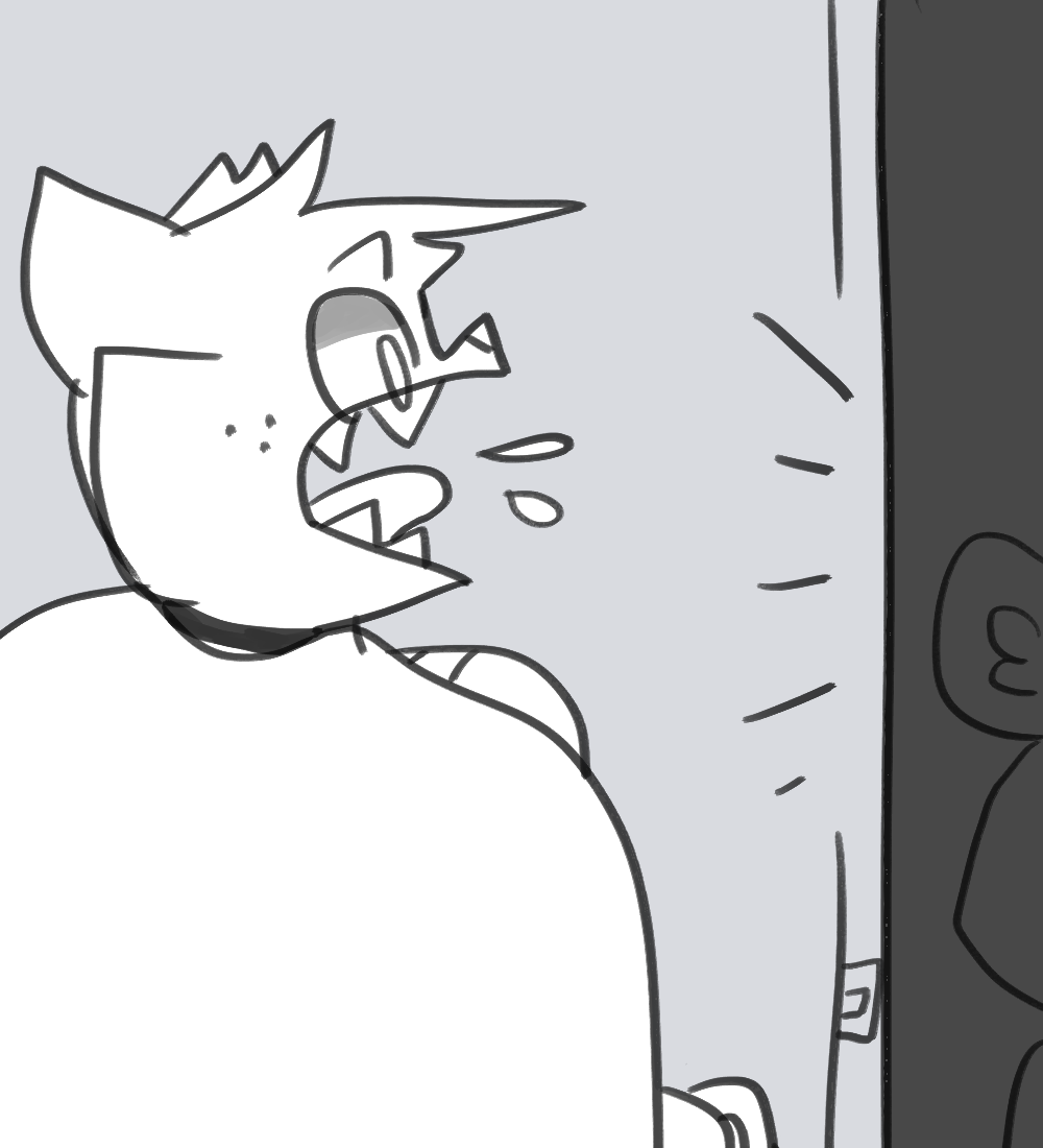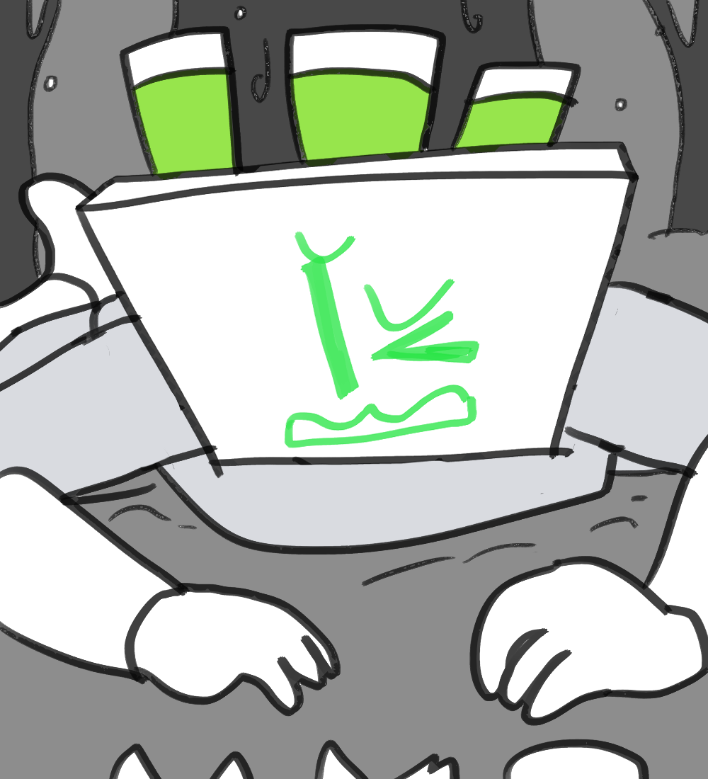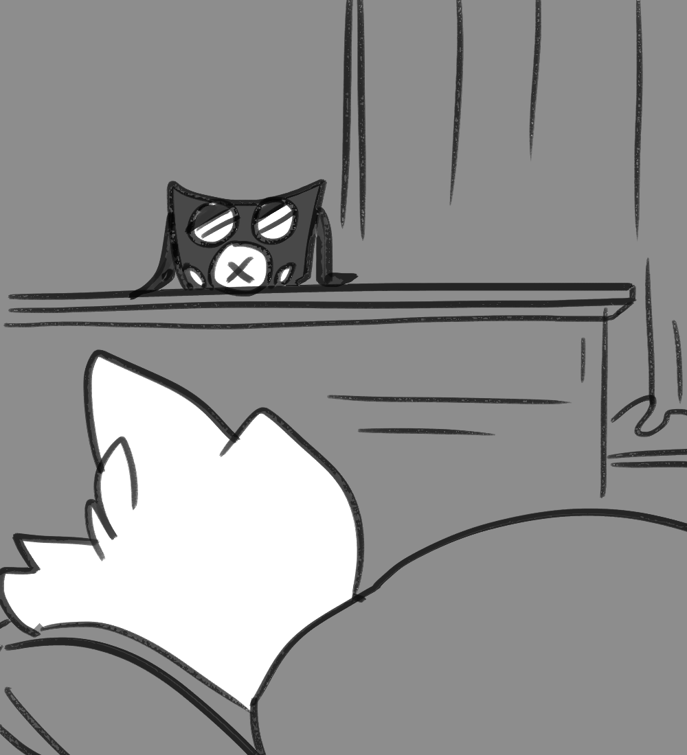 Uzak glances nervously at Maddie’s scaly metal arm then hands over the goods. Maddie rubs her face against the little bar and finds a place to tuck it into her pile, before flopping on top of it.