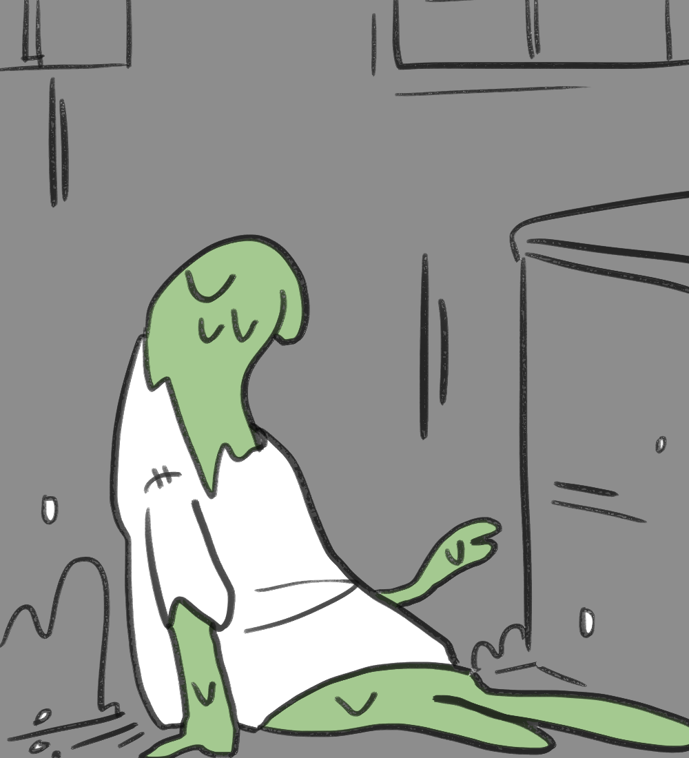 Maddie’s apartment is a mess, furniture piled haphazardly to the side of the living room to make room for a meager pile of silverware and twisted bits of wire. The fridge is on its side in the kitchen and there are plates in the sink that have partially fossilized.