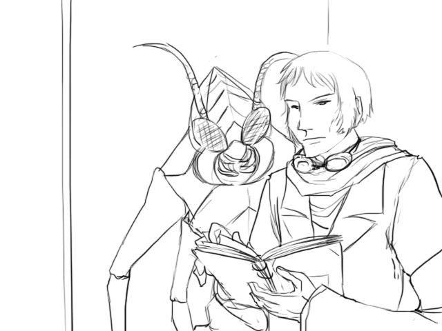 I give the book to the creep. It chitters and begins reading, I guess. I can't really tell.