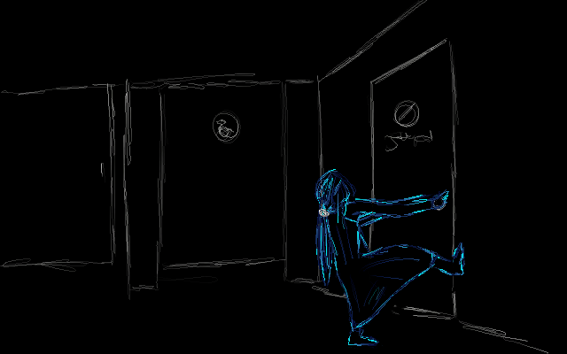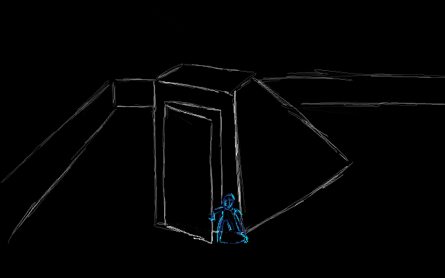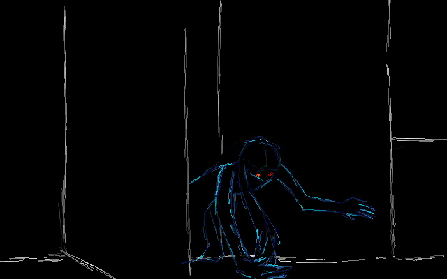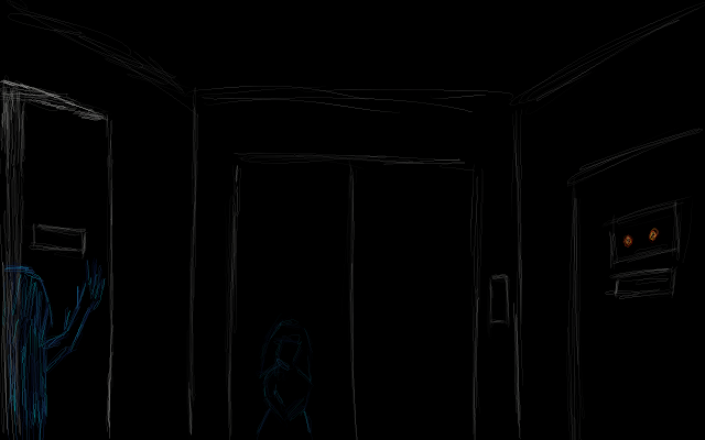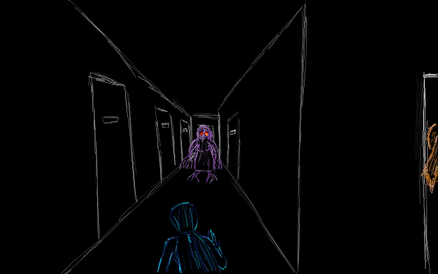 She looks. The doors are behind her. The Watching Thing is behind her. The hall is long. There are doors. She remembers the doors hold Things and people. No innocents. Moving is strange. Her legs drop her. She moves lower.