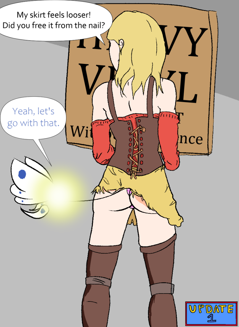 HOWEVER, some of the excess corrosive fro her fairy dust magic to dissolve stuff also got on Serah's clothing, so now her outfit will slowly dissolve without her noticing for now as she continues carrying Mr. Armstrong's stuff..