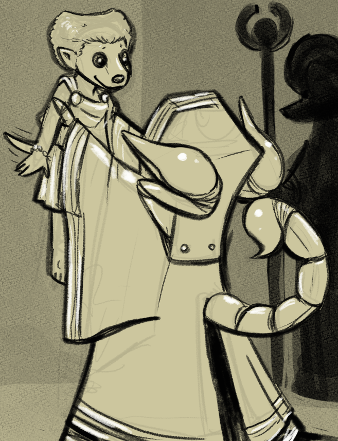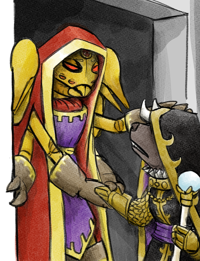 Kalez looks away as she guides Eeyfel down the passage 'you've served me as well as you can, but I failed you in your training, you weren't as strong as you could have been, I was too distracted, I never saw your worth.'