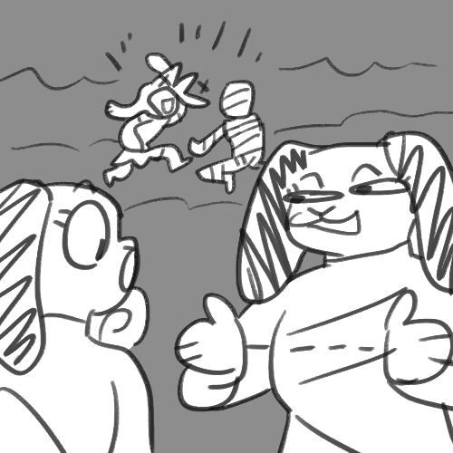 You work perfectly together. It’s so beautiful you cry. Caesar tries to escape by splitting his segments apart and having them run in different directions, but that just makes his squishy insides more vulnerable to bullets. Once all of his limbs have stopped wriggling, you sling Normal’s arm over your shoulder and drag him back outside, Guy following meekly behind.