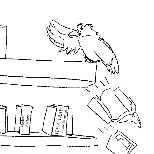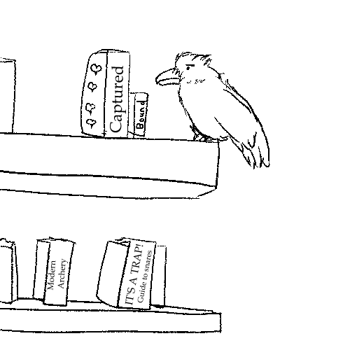 First things first! I’ll find a nice high perch to keep my trophies out of sight. I flap up to the top shelf. Wait, why are there books up here? It’s so inconvenient for people to-