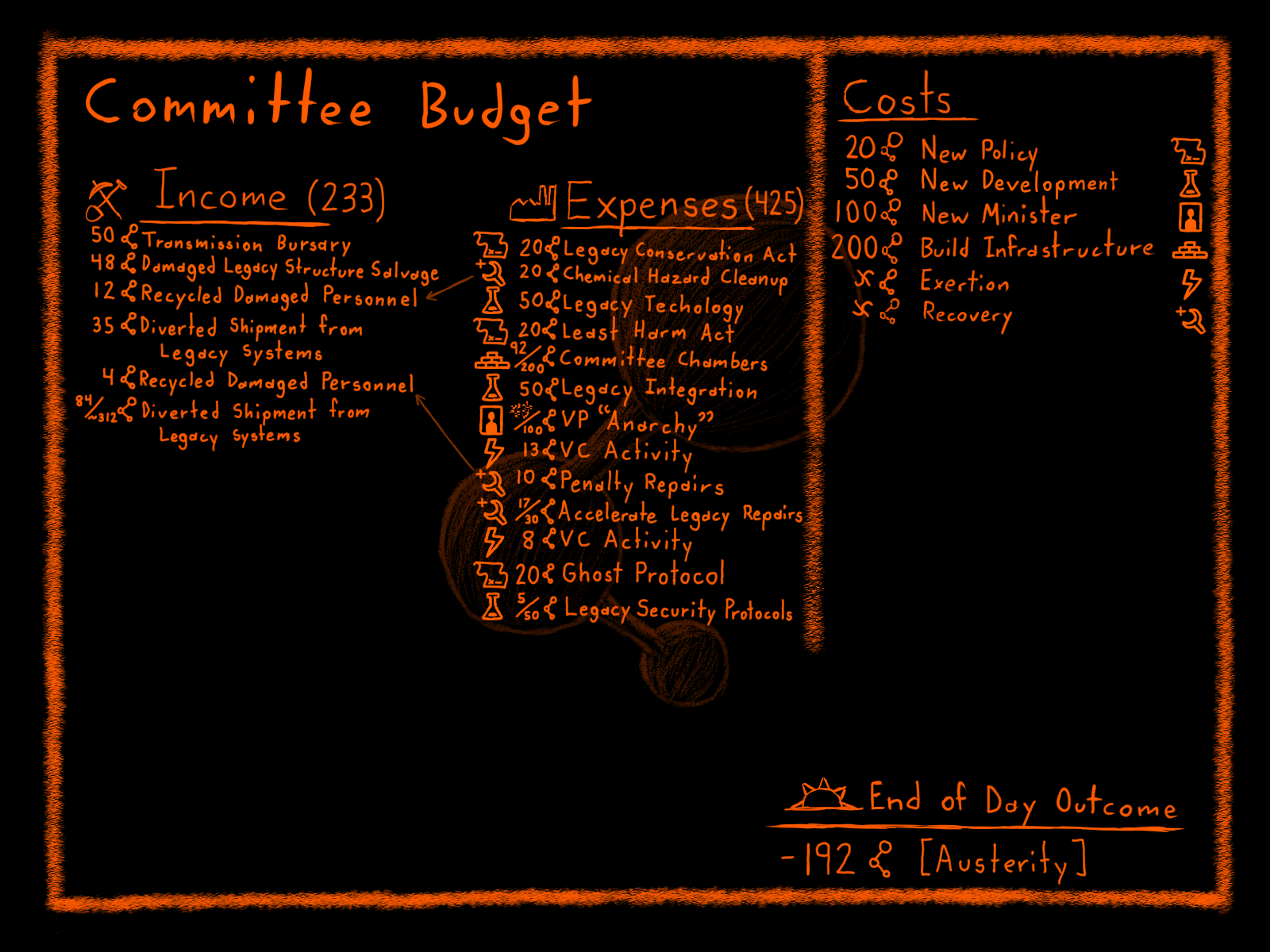 “We prompt the VC (Alex) to amass resources for us to use and finalize the construction of necessary infrastructure and [Minister]s. At this point we would (normally) begin breaking down legacy infrastructure and substituting it with our own.”