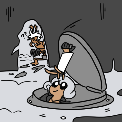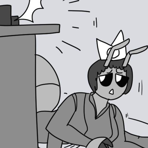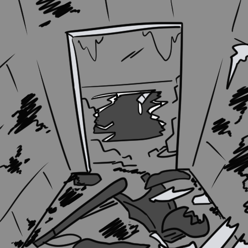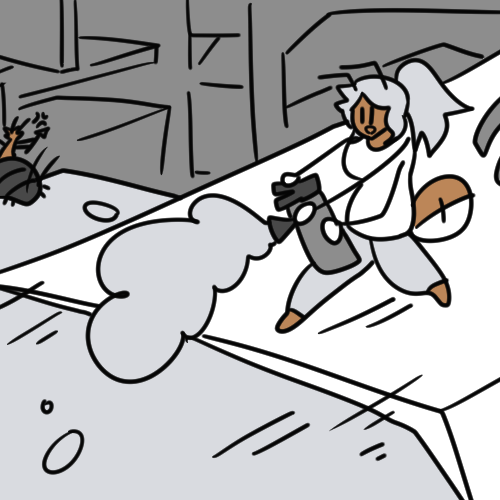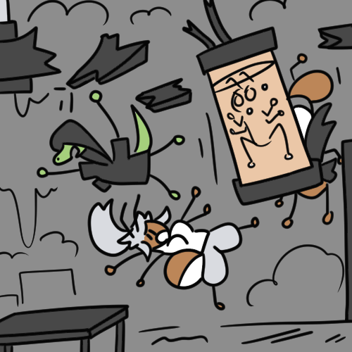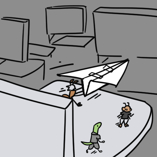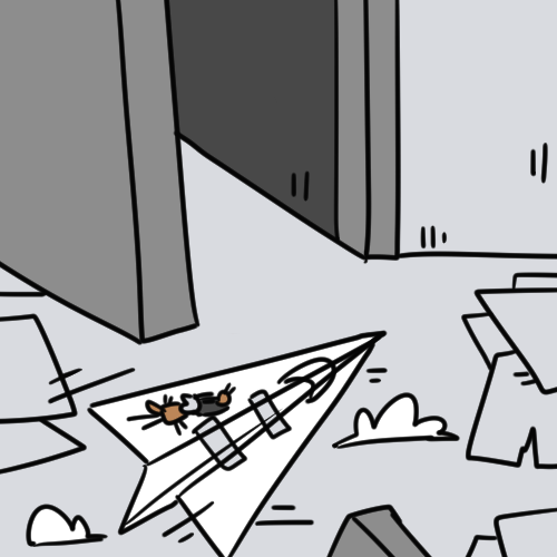 In the meantime, the shifting load on the plane is making it turn towards the desk again, putting us on a crash course. I turn hard to avoid it, coming close enough to the corner that I can see xanthi diving for cover. Some even jump off the sides to avoid us. I keep the plane in a hard counterclockwise spiral to bleed off altitude until we're pointed back at the door, then point the nose down. We skid gently to a stop a few feet away.