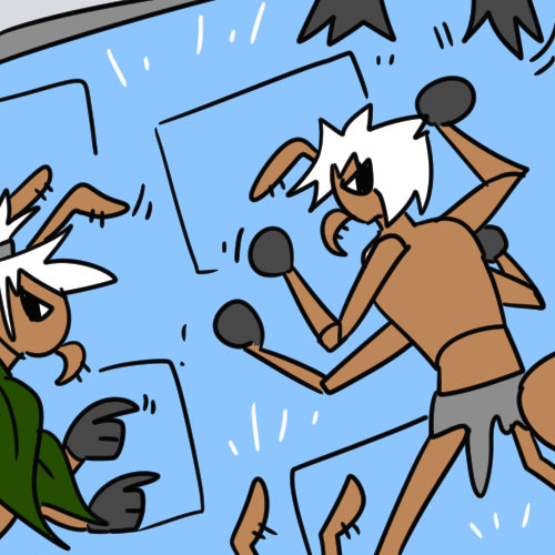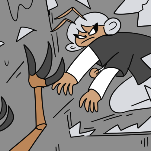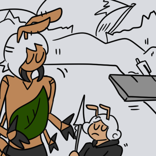 Bright Eyes shifts her grip one hand at a time to the spear shafts, and with Pent and Anet bracing themselves against the roll cage they finally manage to pull her up. The Beformican scrambles onto the plane, tumbling over Pent.