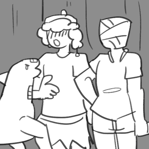 The door is open, and you tentatively look inside. RIDER is sitting with Isabella on the bed, while Willamina leans against the end of the mattress. They’re watching BRAIN WORMS 3 on one of the handhelds the TINKERS put together. Everyone’s eyes are a bit bloodshot from crying.