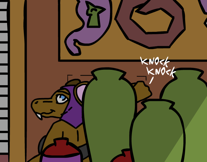 The ladder leads to a really small and uninteresting room… but said room has a simple drape covered door that leads to a much more interesting room! In it, you can see three other portals, probably leading to treasure and adventure, as well as some shelves filled with more of said treasure, and finally a gator guy snoring loudly in the corner. Neat!