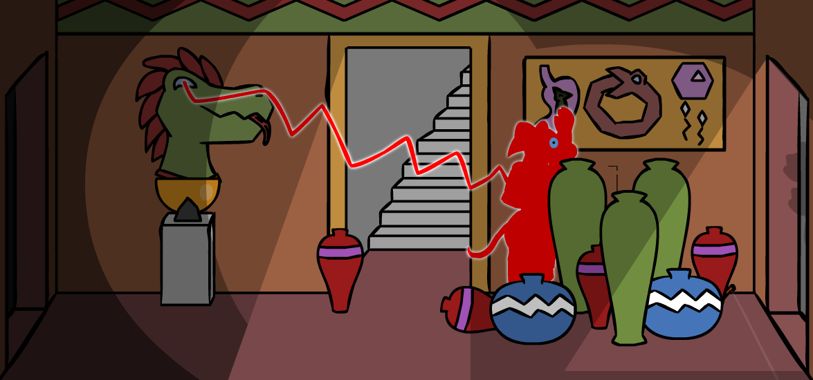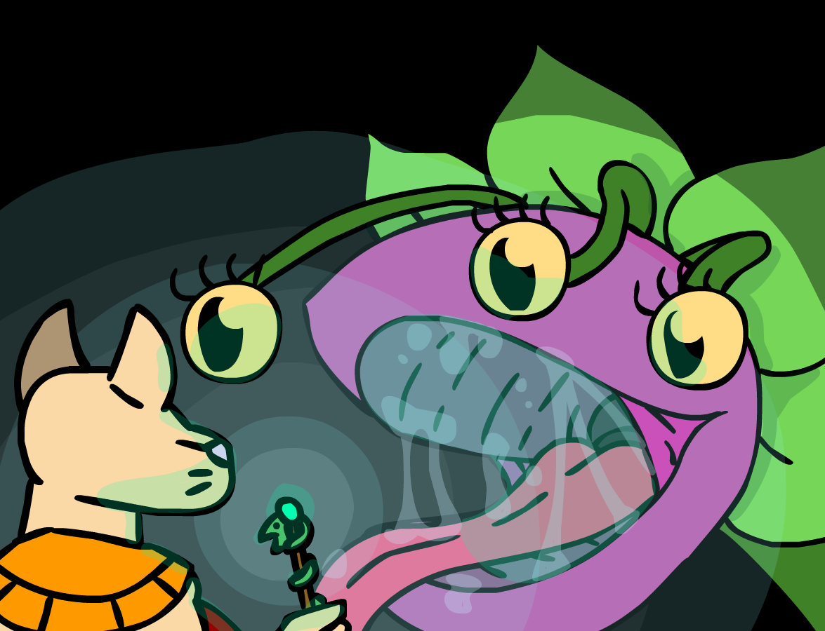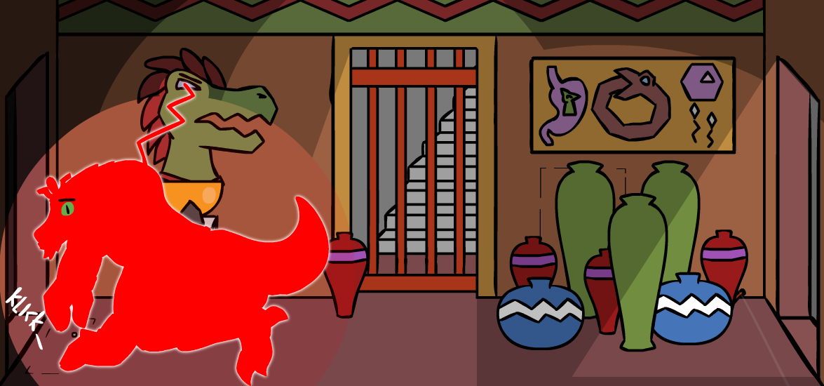 ”Hey, Herod, can I borrow a torch real quick? I got a super fun idea!” you ask your friend as you poke his shoulder, though he’s as usual rather skeptical of your plans, ”…and that idea would be?” You turn around and point towards the room filled with darkness, ”If we throw a torch into the room to the left, we’ll see what’s in it!” but when you look back, Herod is face palming for some reason, ”Kass, there’s a bunch of plant life in there. If you throw a burning torch into the room you’ll just start a huge fire and fill this place with smoke.” You put your paws behind your back, lean forward a bit and give him the biggest puppy dog eyes you can manage while pouting, ”Aw, come on, it will be fun, Herod.” He doesn’t fall for it, though, and simple gives you a quick ”No.” as an answer. ”Bah, you’re no fun.”