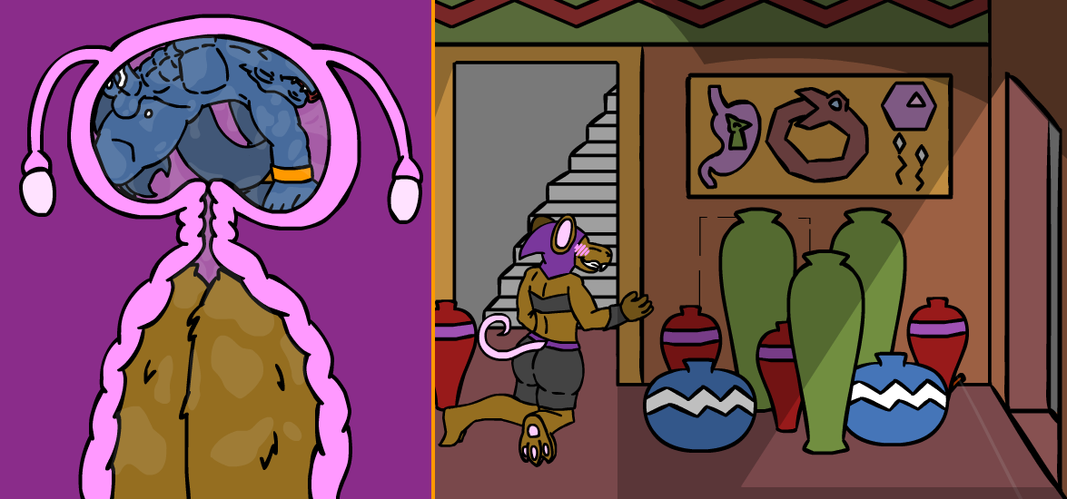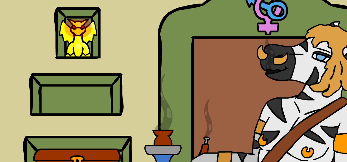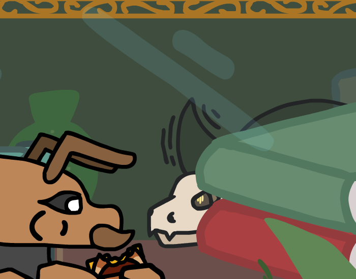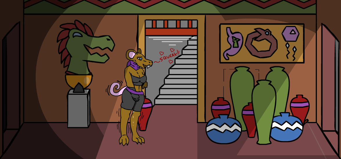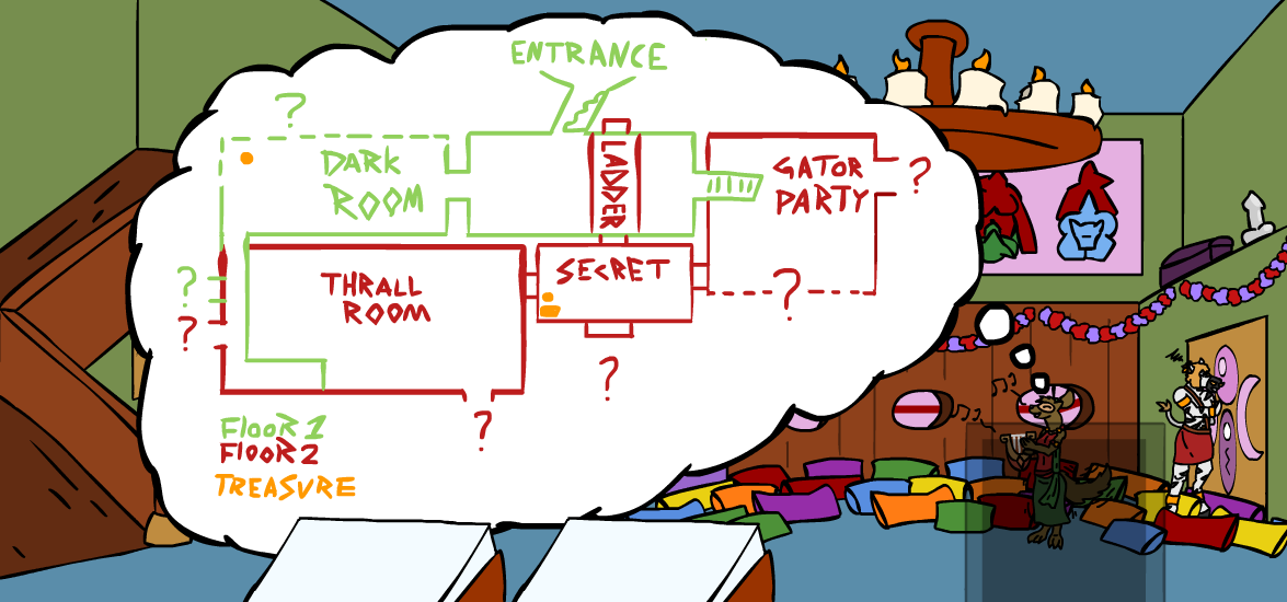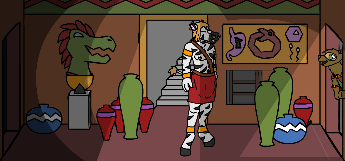 ”A secret passage means something was meant to be hidden! And hidden things are usually the most interesting things around!” The zebra fiddles with his mustache for a bit as he mutters, ”I don’t know…” but before he can chicken out, you interject with ”It’s probably treasure!” which quickly convinces him. ”Alright, you’ve conv- ” but you, in your excitement, interrupt him while bouncing in place, ”And danger!” which clearly doesn’t excite him as much as it does you. ”…next time, stop when you’re ahead, Kass.” he comments, but you’re already halfway down the ladder by this point, so you don’t really care what he saying, ”I can’t hear you from up there!” You spot him crawling into the secret passage above, quickly following you while stammering out ”H-hey, wait for me, dammit!”