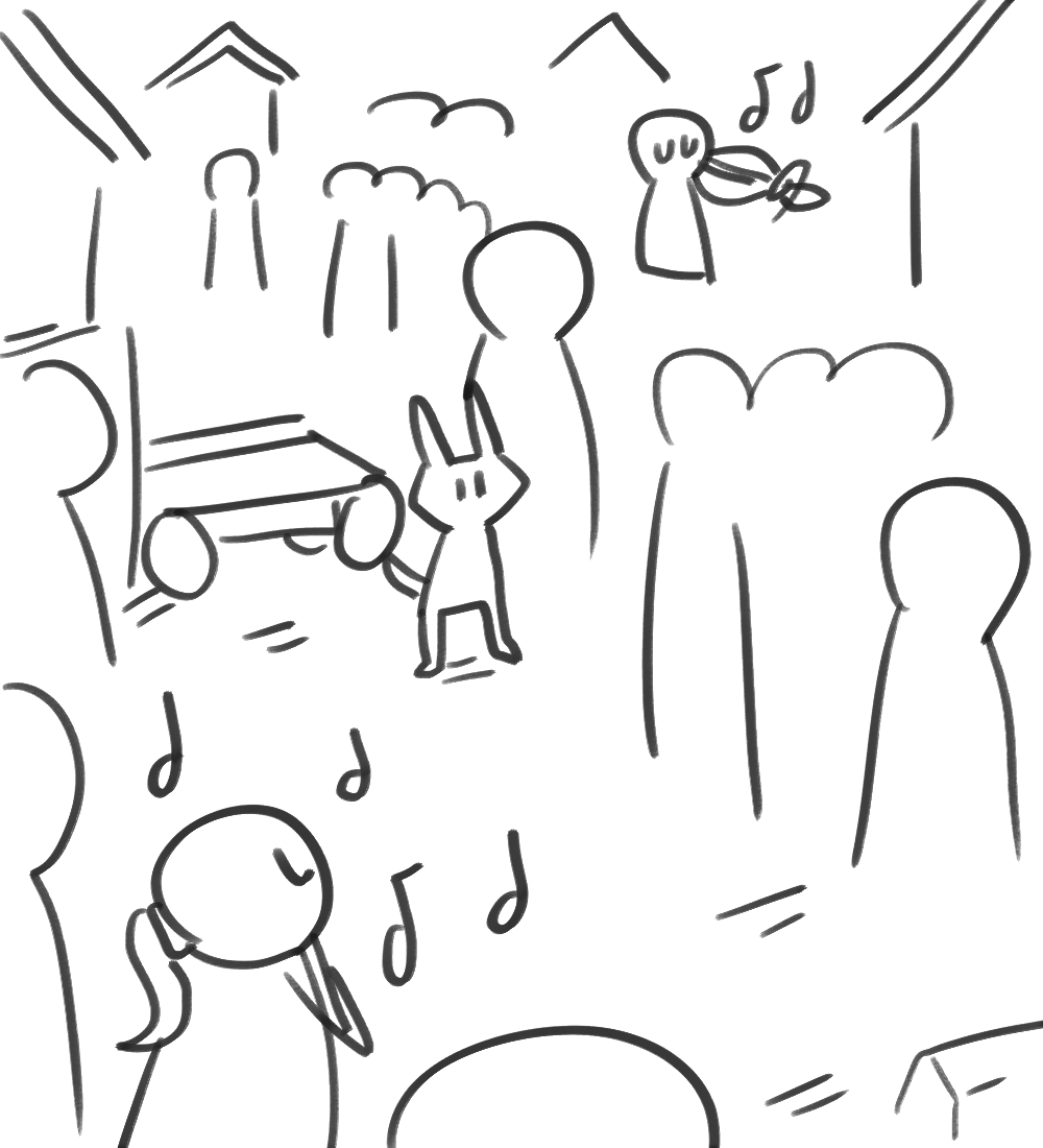 “You don’t have to dance or talk to anyone. Come join the party.” you plead. You take her large paw and lead her back to your spot.