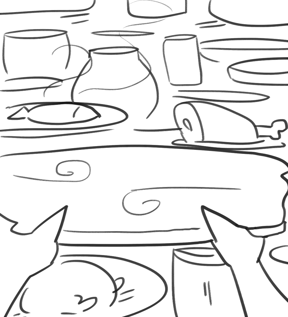 You punch the wall of your cave hard, hurting your knuckles. Your name is Germ and a gentle autumn has come to the mountain where you, your wife Weasel, and child Worm live. It’s almost been exactly a year since you met and fell in love with Weasel, when you were both selected to prepare a Thanks Meal for the great dragon.