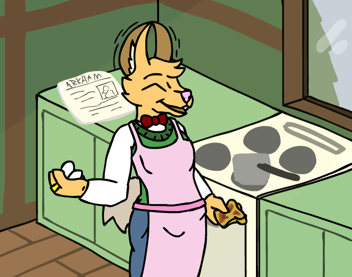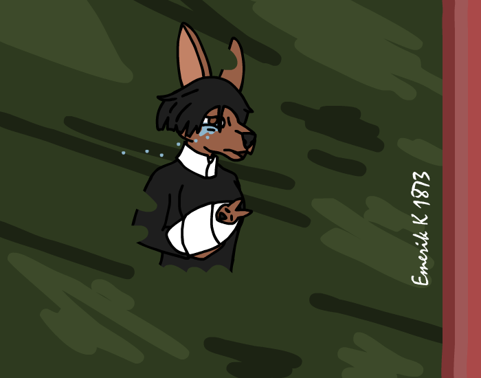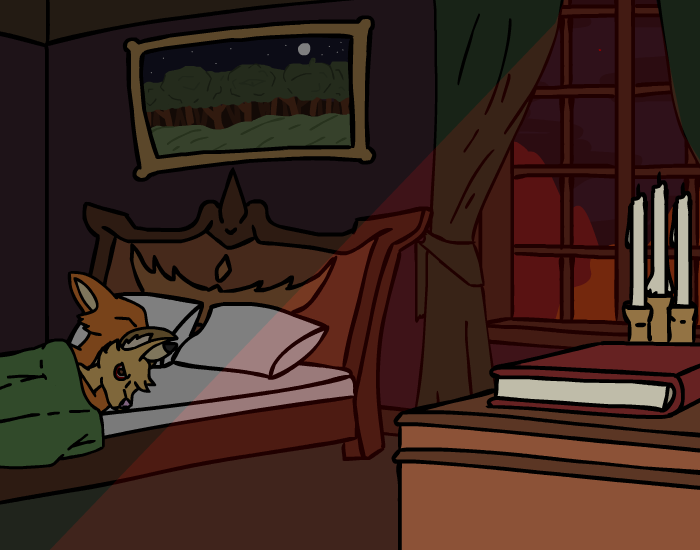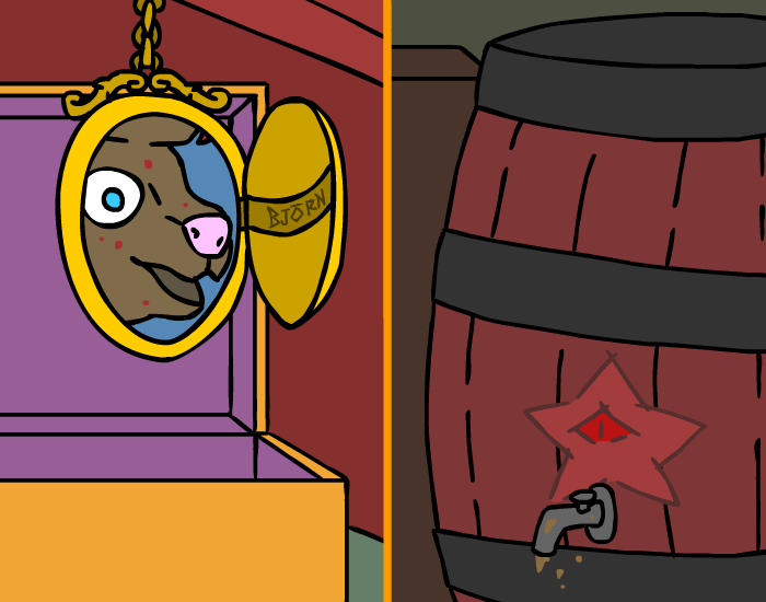 Perry: The dog doesn’t answer at first, instead pulling out his own glass and filling it with the same cider he gave you, “Ah, yes, that old thing. Been meaning to get rid of it but… it got its charm you know? This place used to be called ‘The crow nest’ before I took over, not unlike a lot of other things in this town. They have a bit of a crow theme going on, you know.” he takes a quick sip before adding, “And the eyes are supposed to be brown, but wear and tear has made it look a lot more menacing, lass.”