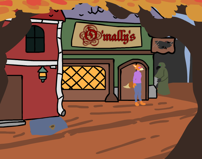 You take a moment to just enjoy the quiet and relax a bit, sipping from your cider. Throwing a glance around the room you can still see the wolf staring at you while the old ladies seem to be… reading tarot cards? Finally, you notices Chris has joined the sailors in some kind of dice game, having a merry time with those strangers... you were wondering where he had disappeared too. He always had a knack for befriended pretty much anyone. Turning your head a bit to look out the window, you can see the raven hobo going through a trashcan on the other side of the street, clearly desperate to find either food or a drink.