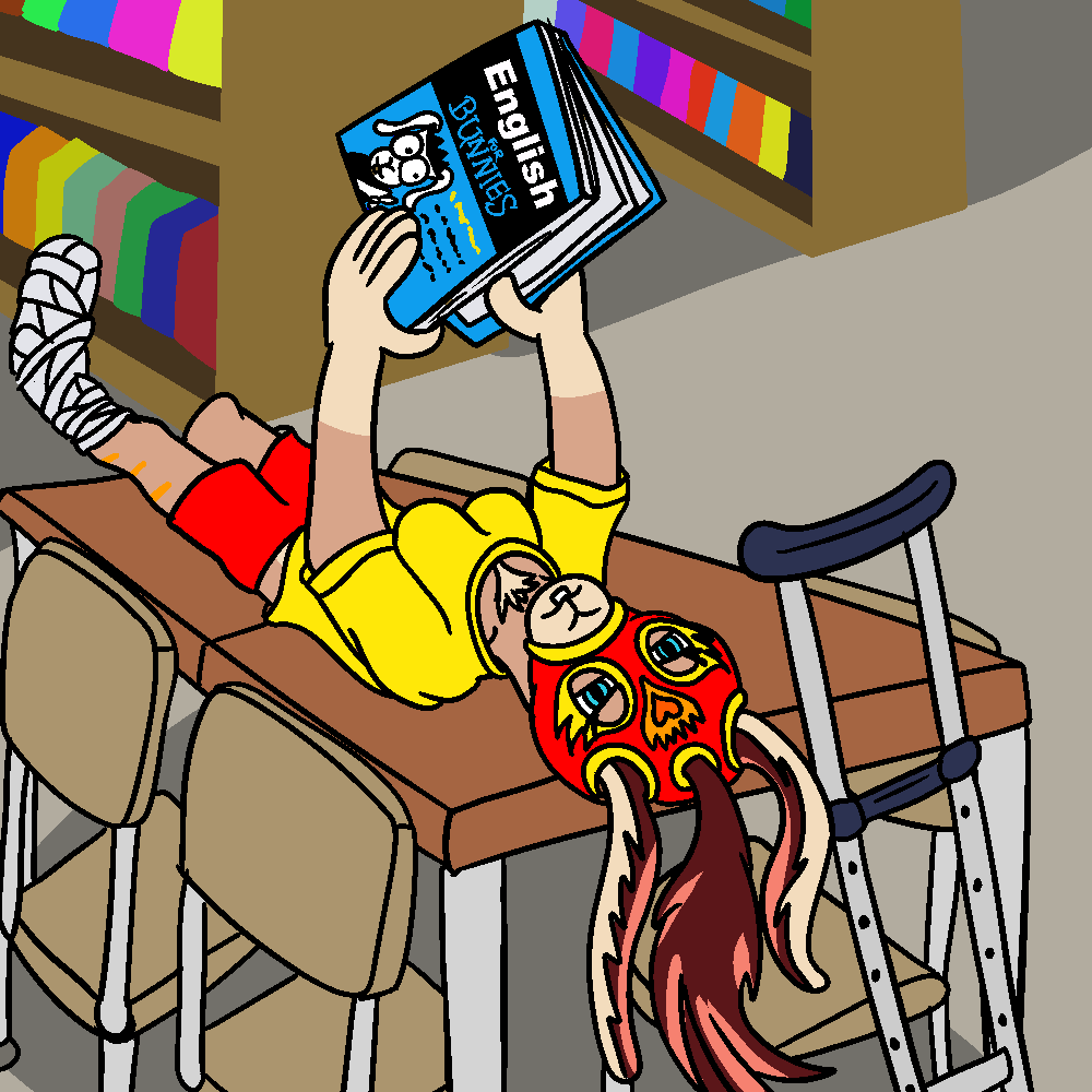 “I do not need help,” I insist, and I grab all the spell books under one arm to prove that I am not afraid of getting splattered, and need no assistance because I am a strong Luchadora with great coordination even when injured and using a crutch because of an EVIL ninja bunny who I hate with A BURNING PASSION.