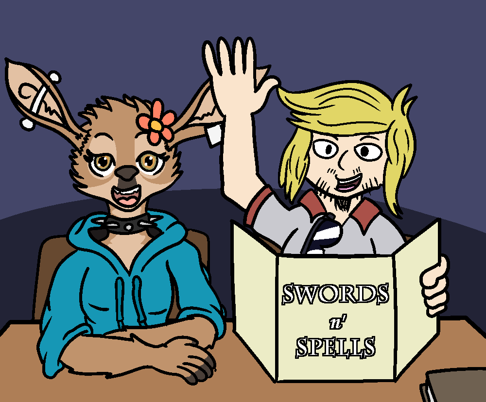 “Close enough,” he shrugs. “If this is your first time playing Swords n’ Spells, there are few books over on that shelf with the rules. Look for the big books with “spells” on it, they really like to pump out splatbooks.”