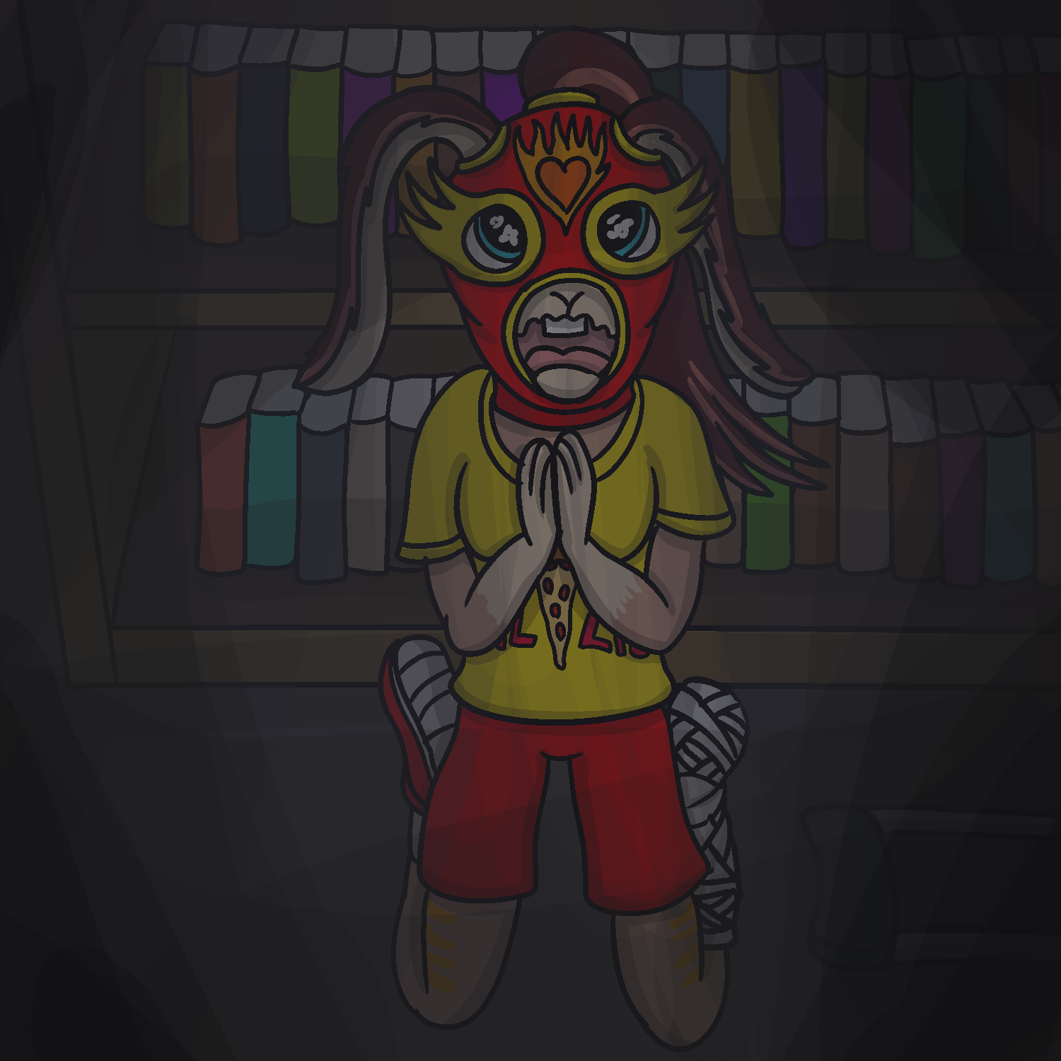 A woozy and wobbling Tsuki grabs the top rope without questioning. All my lucha training tells me to flip her out of the ring, then launch myself at her in a glorious topé suicida… but she robbed me of all my high-risk maneuvers. Instead, I chop her once, twice, three times on the back of the neck and twist her arm as hard as it’ll go, drawing out a cry. It crescendos into a shriek so loud I see a CRT monitor crack.
