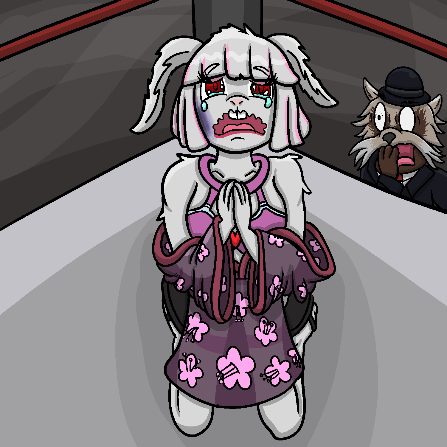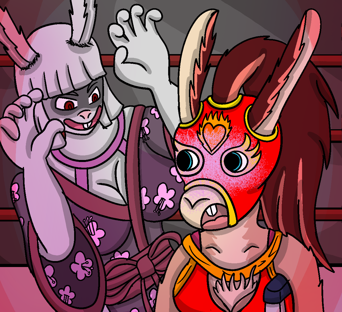 “How could this happen?!” Kitt Sune wails over the loudspeakers. “Dusty, this crazed rabbit has pounded poor, precious Tsuki! Nacha’s plucked Tsuki’s precious petals! Has she no heart?”