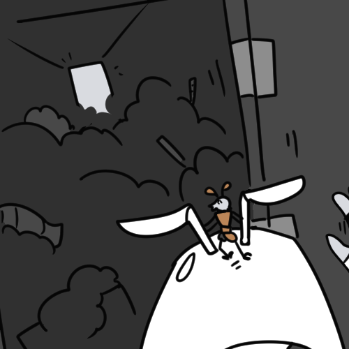 We teleport back to the glass hut where we entered this room, and wait for the drone to be looking away when we run back to the microscope. Anet hands off the clicker to me in case it’s needed, as they will all be jumping up to the top shelf to push the cage together. Aiming manually, I target all three girls with the 1-dose, growing them into miniature giants. They back away from the arms, and I input a 1/16 command targeting the desk, in case the power gets switched off. The arms search the target zone but find it empty, displaying an error. That zone being empty didn’t seem to stop it from spraying the closest object last time, so it should be fine. I switch the controls back to manual and look up at Jaina one more time.