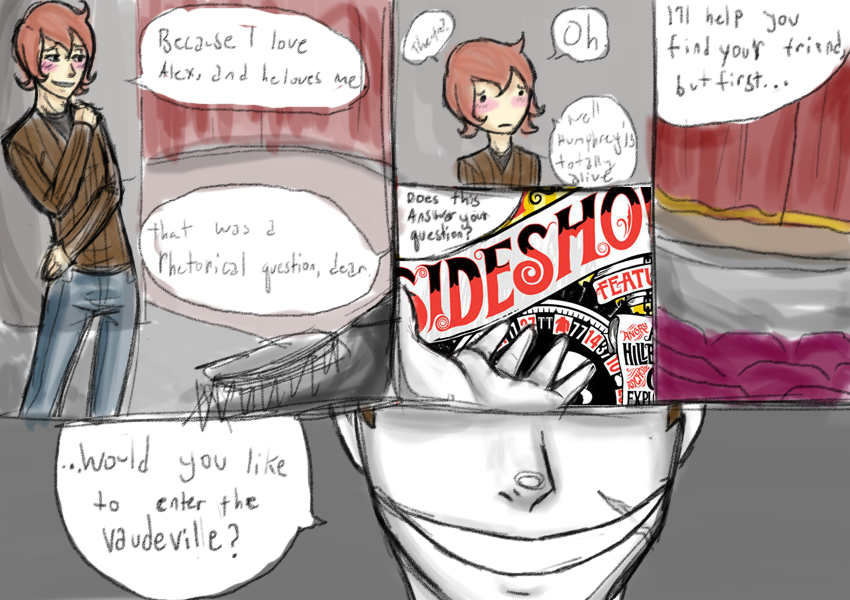 Tercival swiftly points to a poster by the door. It has a gaudy, circus-like design and depicts sideshow performers. "Does this answer your question?"