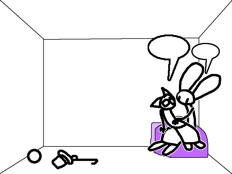 ALTERING INTERFACE READOUT SETTINGS FOR IMPROVED READABILITY Prop "Comfy Bed" recolored. >Bunny A: "What!" >Bunny B: "It just changed colors!" >Bunny A: "I don't understand what's happening!" Modifying actor Bunny_B.ears *1.5 >Bunny A: "Your ears! They're growing!" >Bunny B: "Oh god! Are you sure?!" Forcing action "hug" on actor "Bunny A", target: "Bunny B" >Bunny B: "Why are you hugging me?" >Bunny A: "I don't know! I can't stop!" Muting Bunny B. Object "Super Bouncy Ball" spawned.