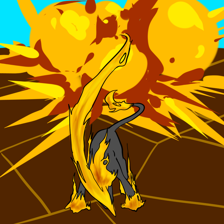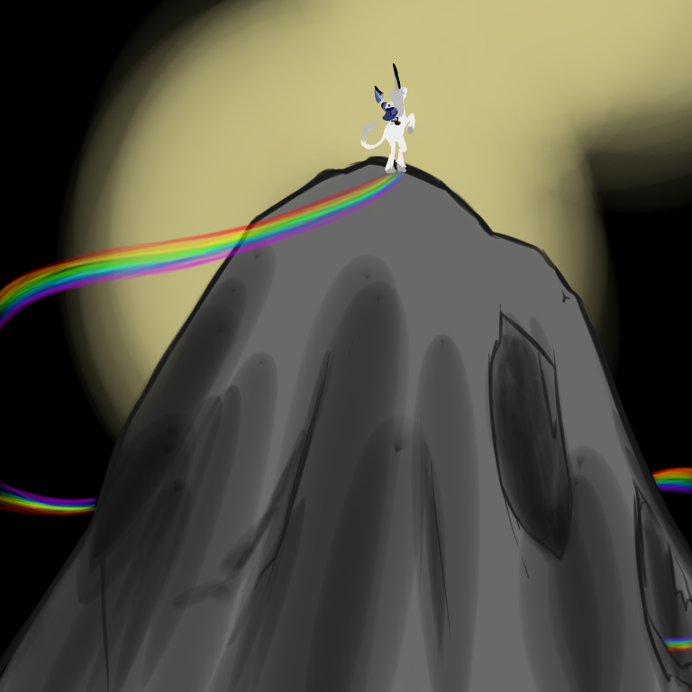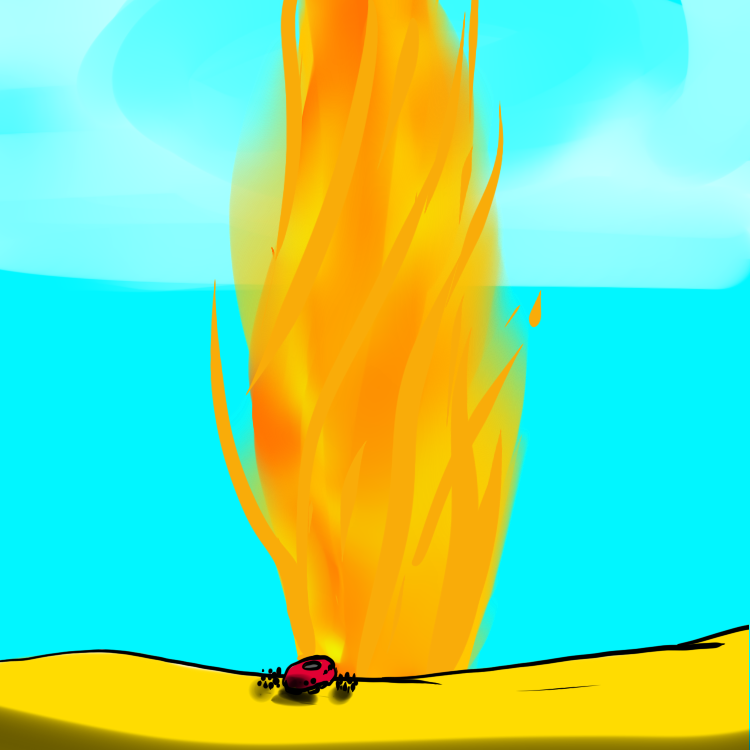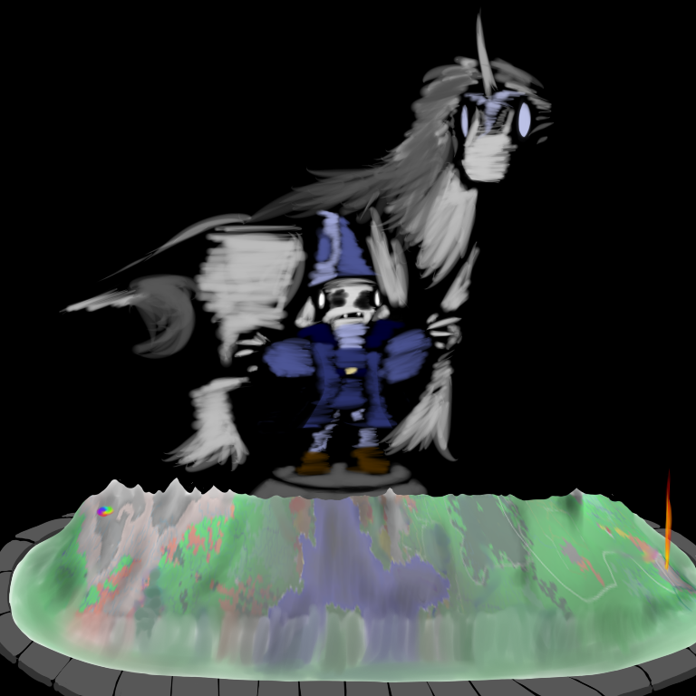 He approaches it, and stands on a dais before it and stretches out his hands. The sand begins to swirl and raise up, becoming a representation of the world in it. On one side of the world, in the mountains, there appears a swirl of rainbow light. On the other side of the world, in a desert, there rises a red spike that appears to be a flame.