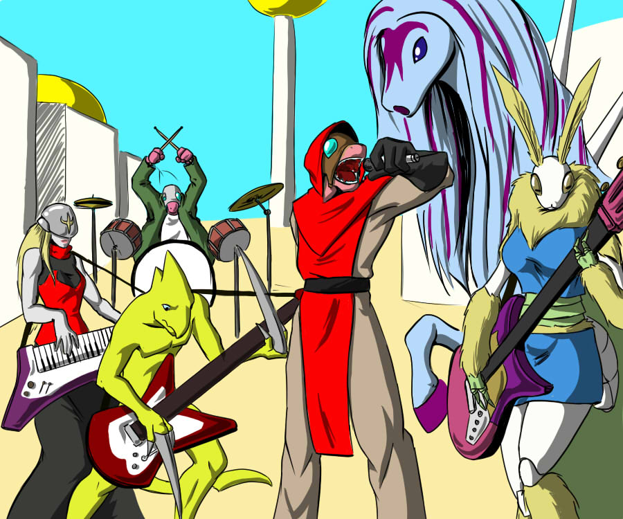 Spikesby seriouses the fuck up as the approaching sound of music cues him that something is afoot. The large figure from desert crests a sand dune coming into view.