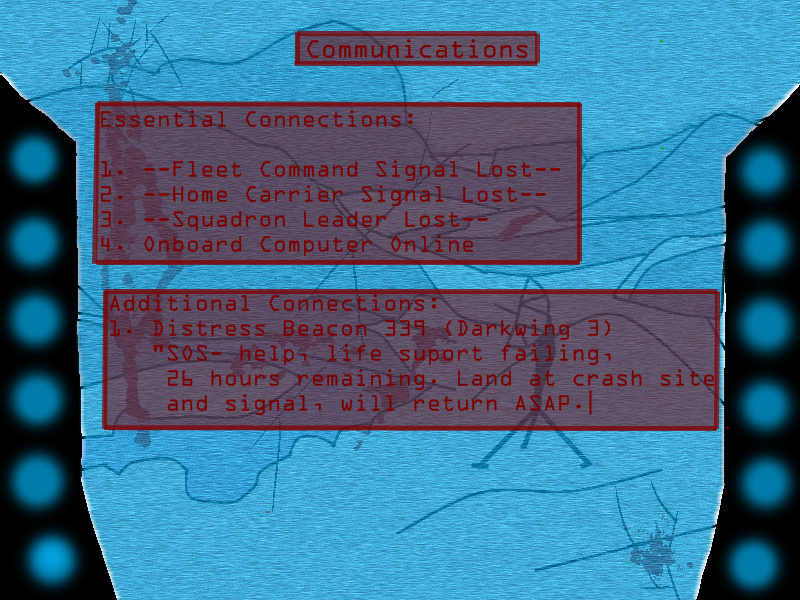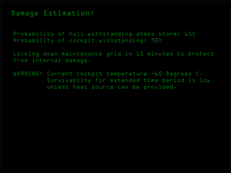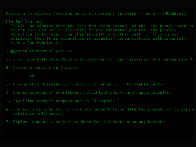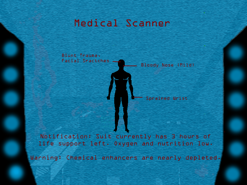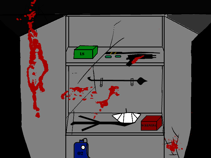 The sight of the provisions inside gives you some slight relief. There is a box of life support extenders, a taze baton, two 12-hour power cells, a S1 Service Pistol, a utility bar, an unidentified box, a distress beacon, and a tank of oxygen complete with narrow tube.