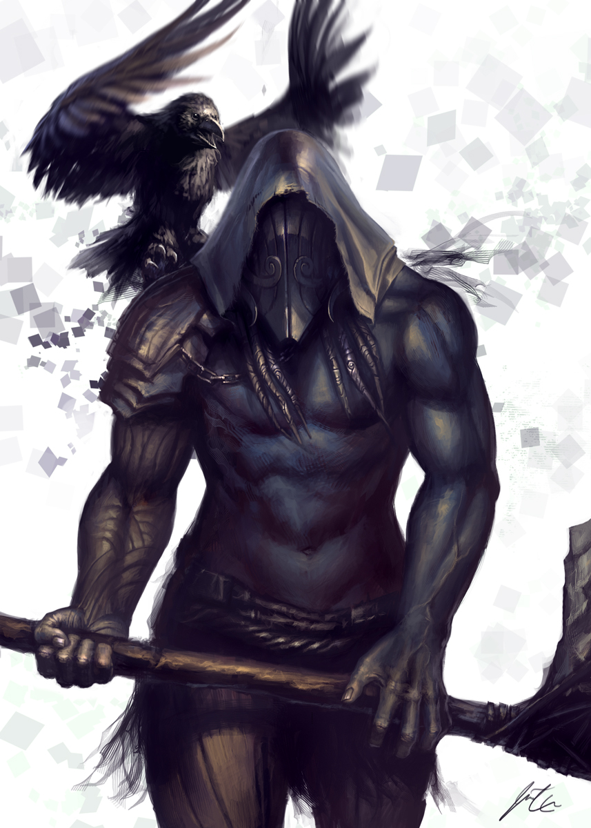Abject nonexistence, the despair of nothingness, the inevitable after when all events have ended, and time winds down, that beyond the pall of energy, the great entropy of all to nothing: These ideas are forced into the somber core bearing the title Nihilino. The largely spherical lump of flesh explodes into action, skin stretching and warping, growing bone white, and wrenching about as if to shed its skin. Finally it composes itself, a completely featureless, twelve foot tall and completely featureless humanoid shape, before the center of it's head simply explodes, showering the surroundings with gorey chunks, the gaping wound slowly being desiccated into absolute uniformity, as the world vanishes when gazing through the opening, promising oblivion to those whose stare lingers overlong. A cloak writhes free from gashes that sprout on it's body, and leather as black as sin tightly bind about the form, as excess nothingness floats behind the figure, a cape and wings alike, from moment to moment. The being puts a fist to the ground, Nihilino genuflecting before me, wordlessly offering its absolute service, its everything to my will.