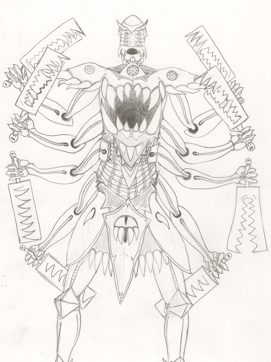 Dust, bones, the withering of flesh, the theft of vibrancy by time.... the taking of life, in bits and pieces, with the grind of forever. The musings of those fearfully clinging to the end of their mortality find their cries falling on deaf ears, the unflinching gaze of death, old age, and rot. These thoughts fill my mind as I name this second Deep Spawn, and it's form immediately falls apart, dissolving to sand as it pours from an invisible spout, draining a miniature desert onto the ground, growing into a mountain, that iself dissolves, revealing the kneeling form of a skeleton, its bones alien, spurs, spikes and fangs naught seen on any living thing traverse it's surface, and upon its body, chitinous armor worked into depictions of wailing beings of all sorts, seeking reprieve from their own frailty, the images in question constantly shifting, displaying the quintessence of mortality, of knowing an end comes. the ten foot tall archetype of an organic deathknight's fleshless, eyeless glare falls upon me.