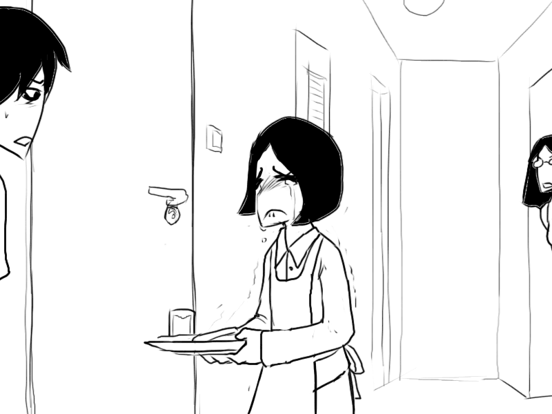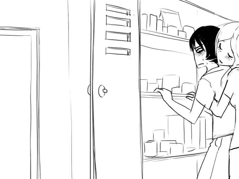 >"..Oh, uh.. I was trying to look for something to drink, but I see you only keep.. well, not drinks in here."
