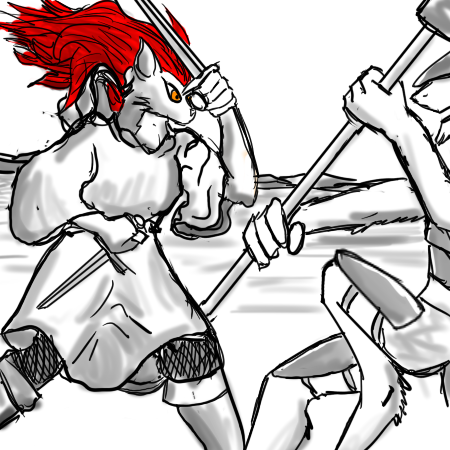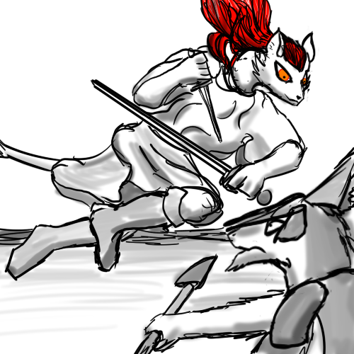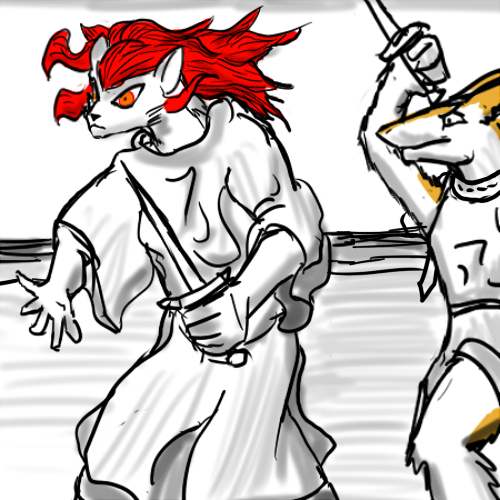 "I was part of a real caravan. Seven wagons, under a Northern driver... My owner. Two or so days ago, we were set on by a small band of foreign warriors. Two elves, an old southerner, a gnoll, and Shadran. The others seemed impressed by her, even though she didn't fight, then. The southerner wanted us all freed," Aphek says, clearly guarding his voice not to sound sympathetic.