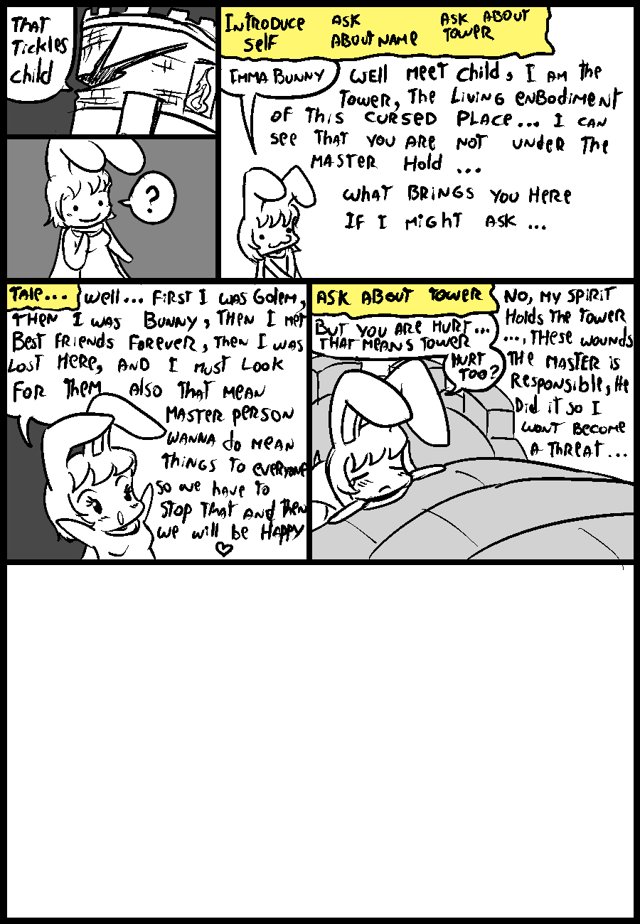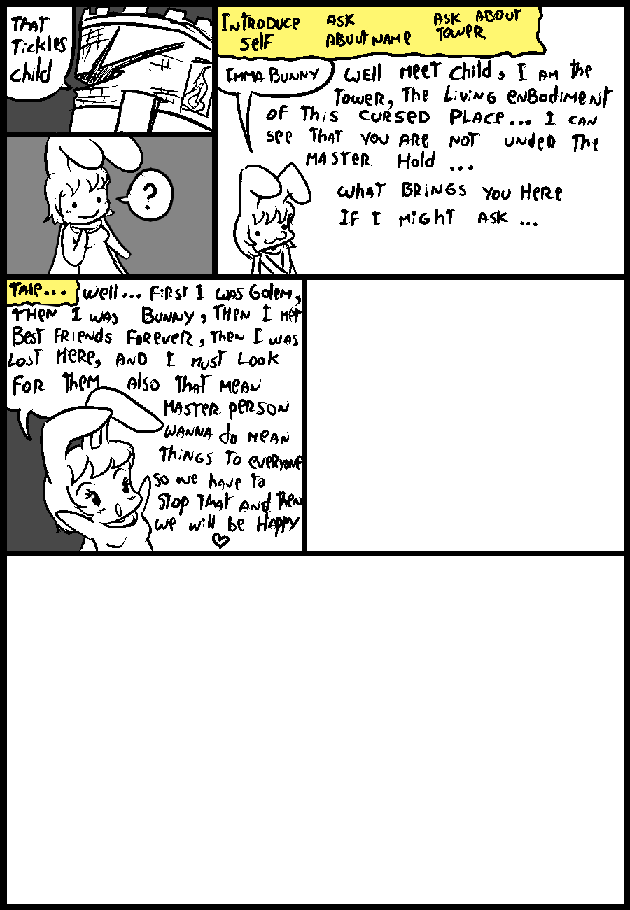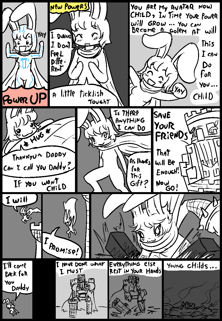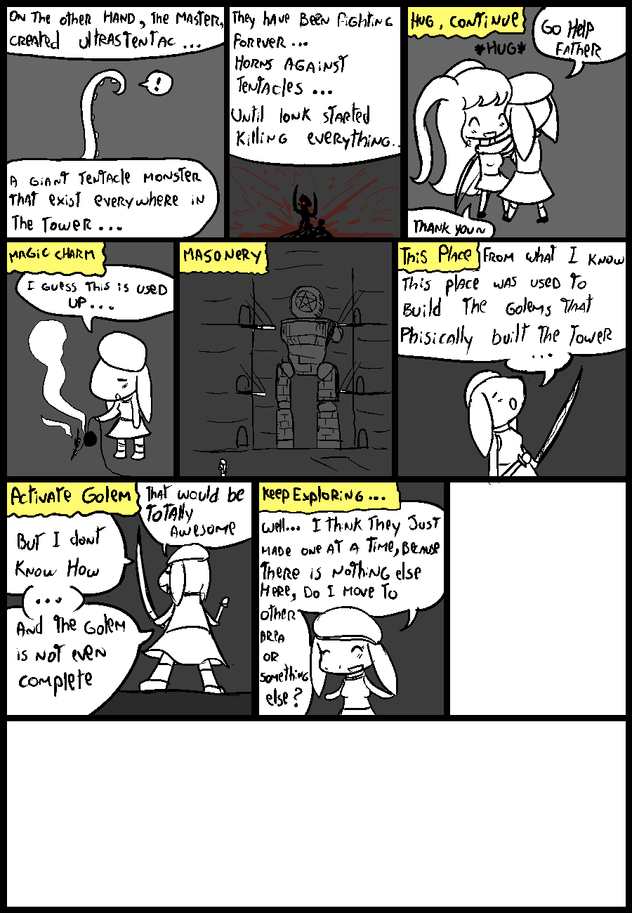 thanks for the exposition. us voices met the great golem king. he told us that with his death the tower would weaken, he gave the bunny girl the golem powers. and then when she left, he died, glad that he could do something to help. father probably wants to die too, to weaken the tower as well, but can't until he is sure his children are safe.